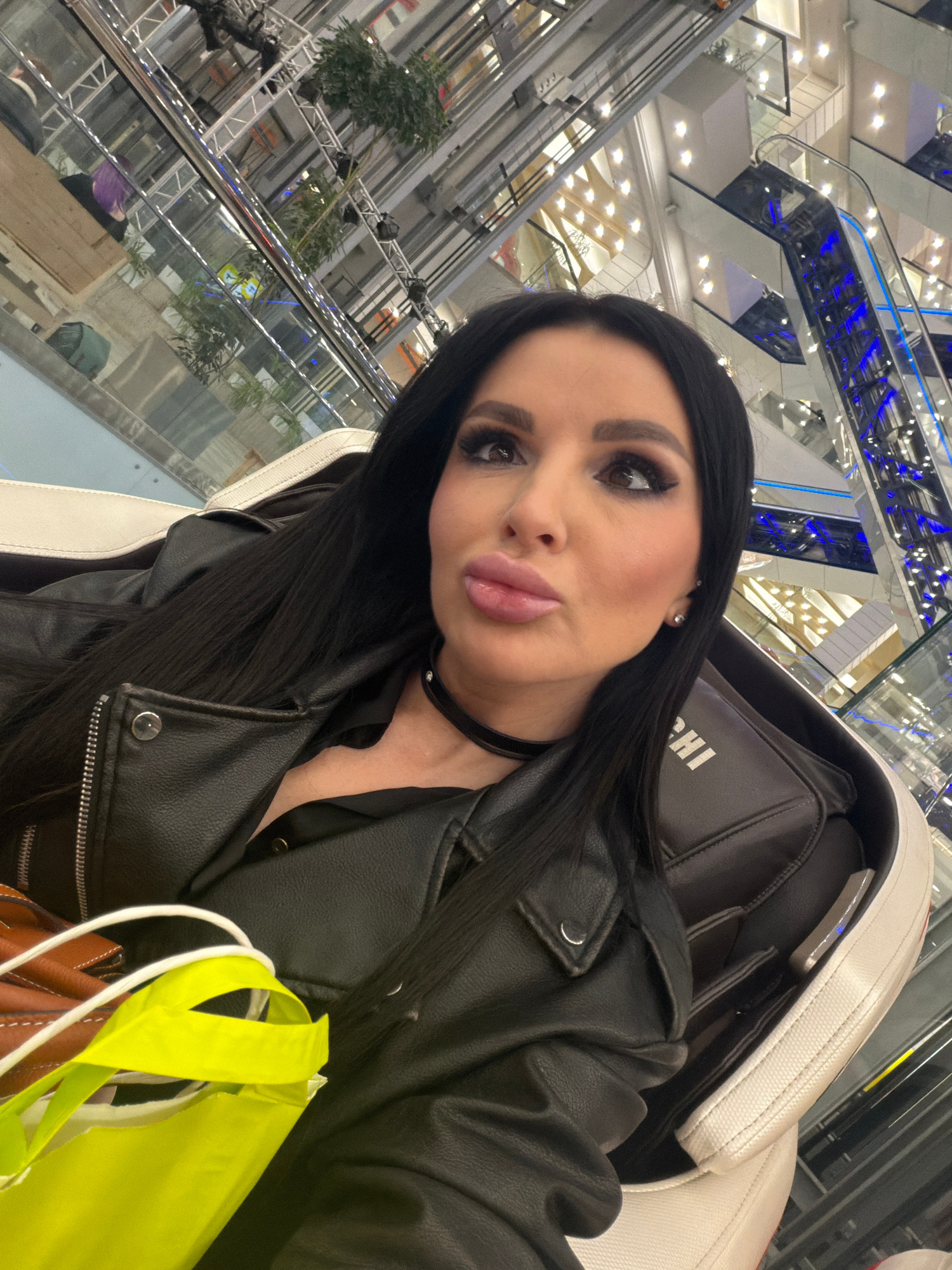 A woman is taking a selfie in what appears to be a shopping mall. She has long, dark hair and is wearing a black leather jacket and a choker. She is sitting in a massage chair. A yellow shopping bag i…read more