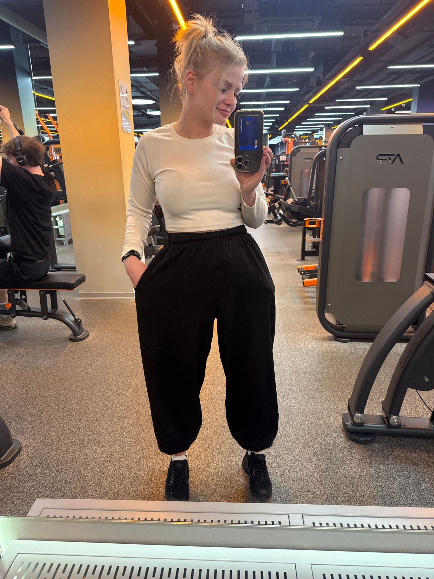 A gym interior in Saint Petersburg, Russia, features a blonde woman dressed in a white, long-sleeved shirt and black pants, taking a mirror selfie with a smartphone. Exercise machines fill the backgro…read more