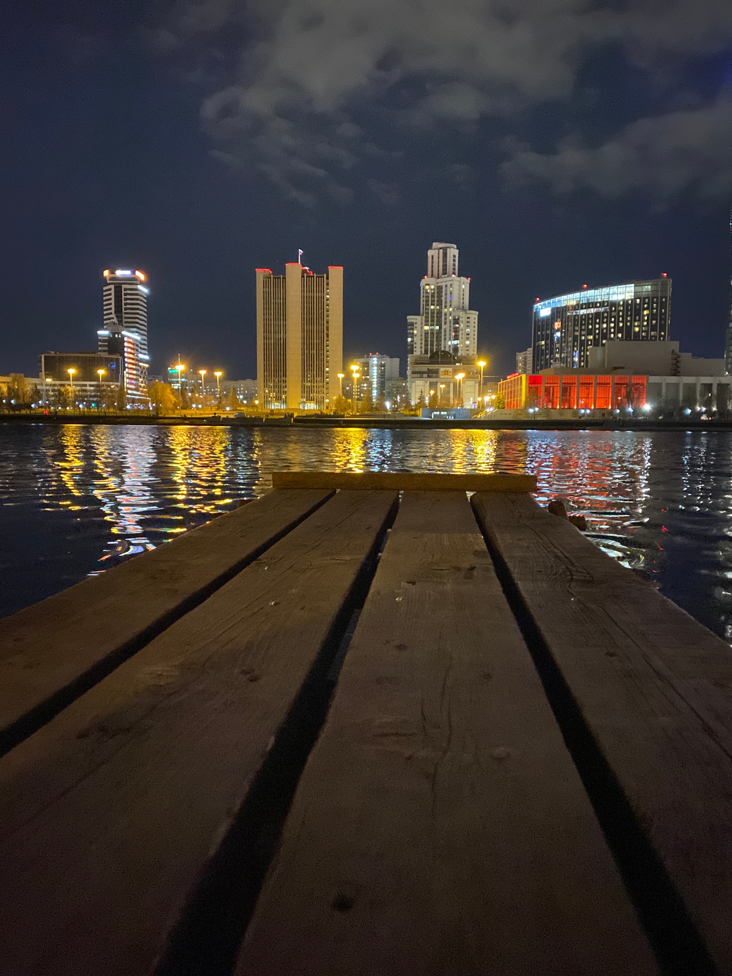 At night, a dock or walkway made of dark wood stretches into the water. The water reflects the lights of the city of Yekaterinburg, Russia. Several tall buildings are visible in the background, along…read more