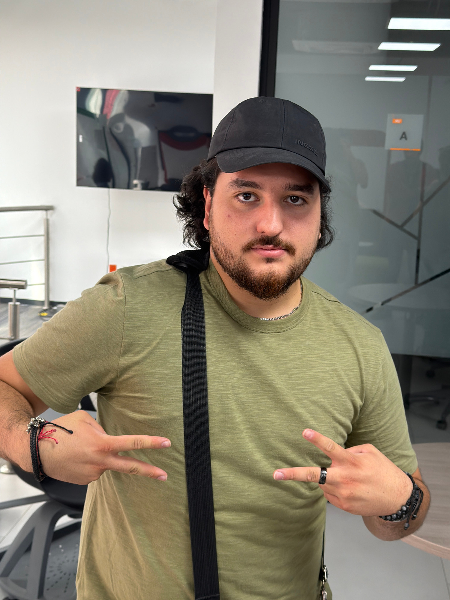 A man with dark hair and a beard is shown indoors. He wears a black cap, an olive-green T-shirt, and a black strap crosses his body. He makes hand gestures, holding up two fingers on one hand and poin…read more