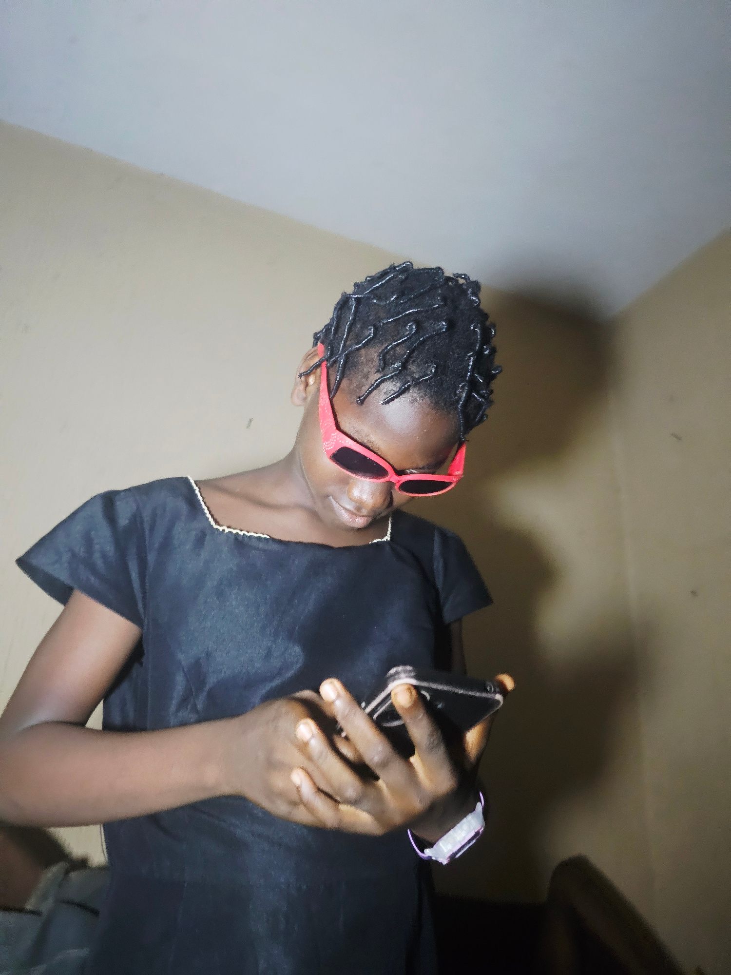 A person is indoors in Nkwelle, Nigeria. The individual is wearing red sunglasses and a black garment with a white-trimmed collar. They have dark hair styled in twists or braids. The person is holdingβ¦read more