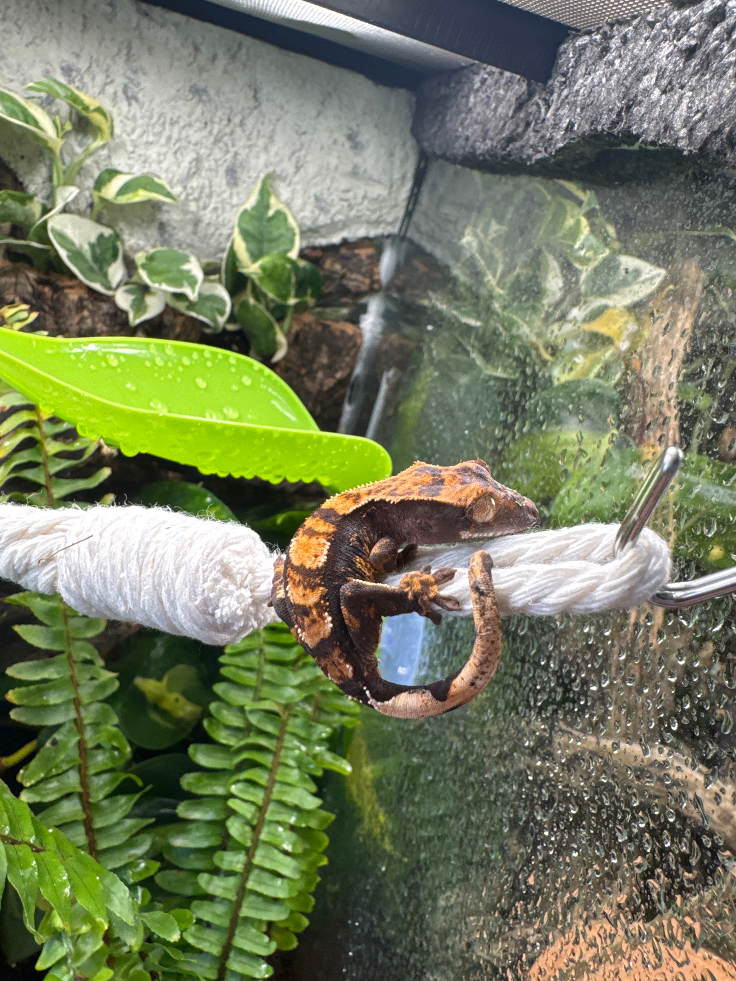 The image shows a crested gecko clinging to a white rope suspended in a terrarium. The terrarium contains various plants, including ferns and pothos. Water droplets are visible on the glass. There is…read more