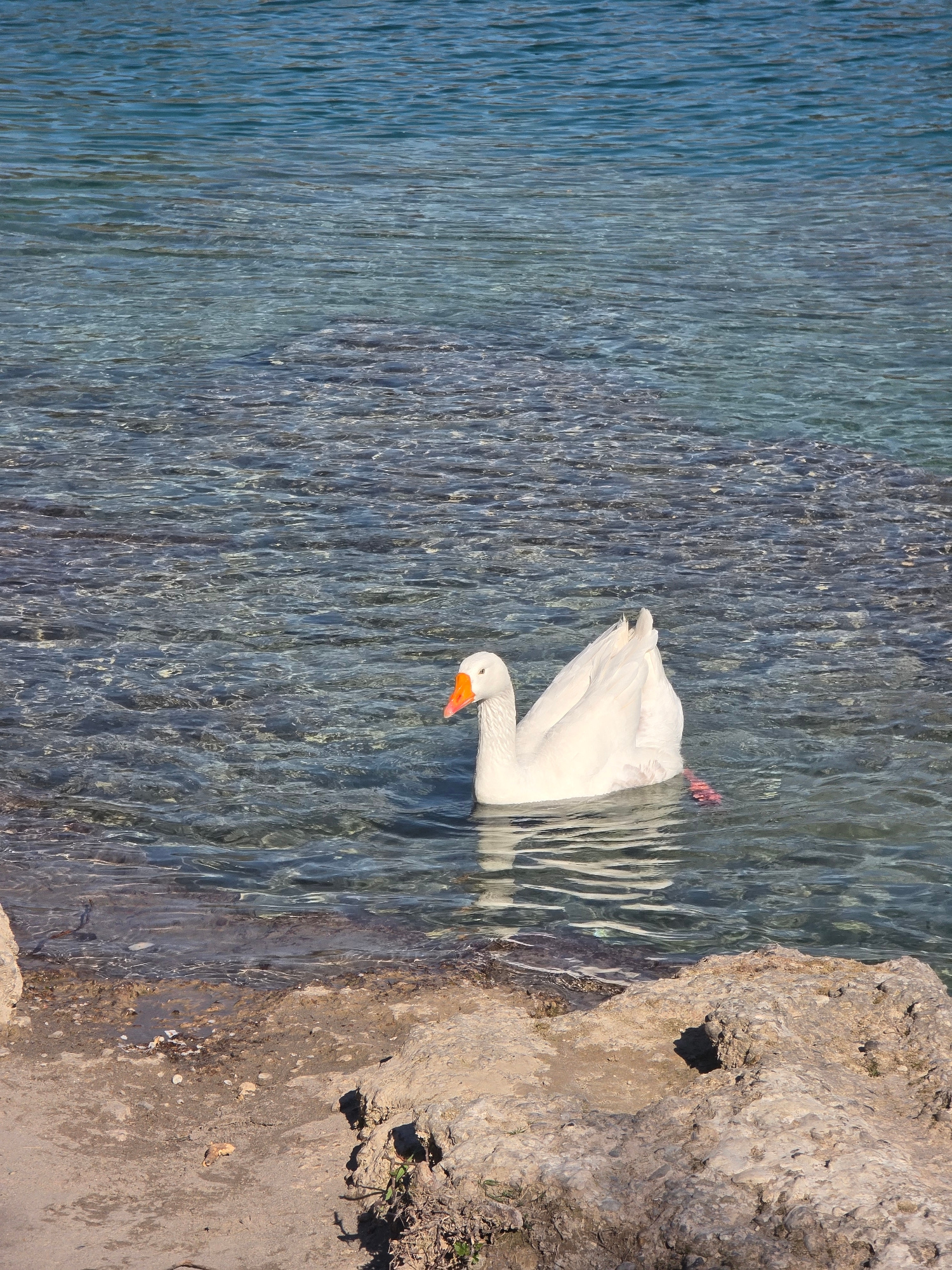 A white goose swims in the water along a rocky bank. The water appears clear with a blue tint. The rocky bank is light brown. The image is oriented vertically. This photo may have been taken in Podgorβ¦read more