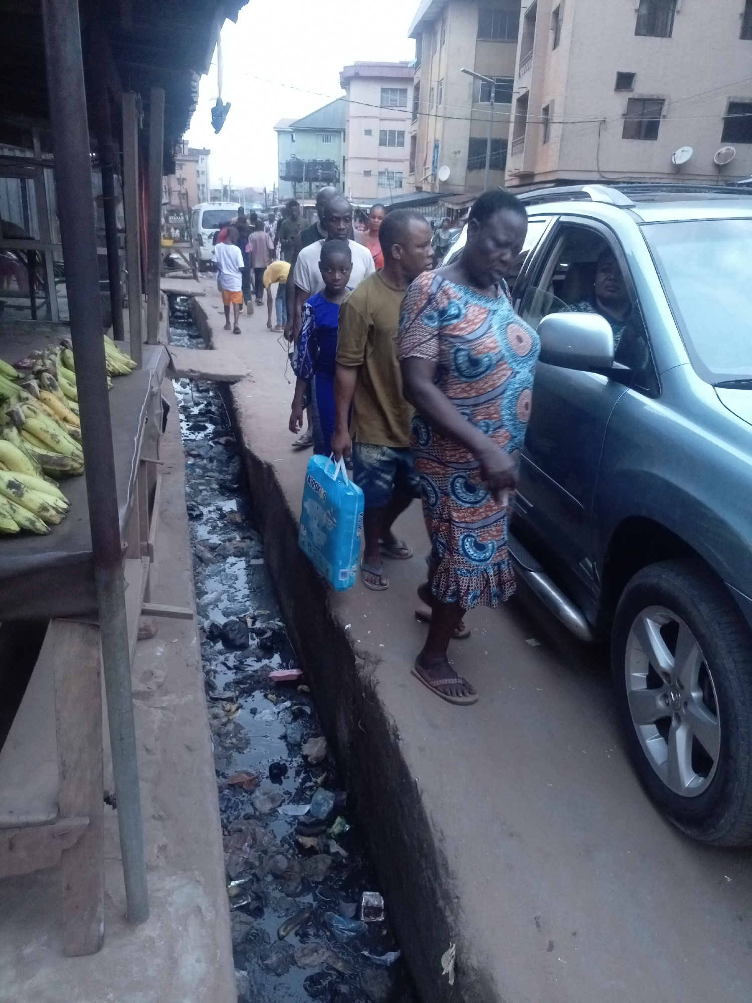 This street-level photograph captures a bustling urban scene in Onitsha, Nigeria, showing a mix of pedestrian activity, local commerce, and a roadside environment. In the foreground, a group of peopl…read more