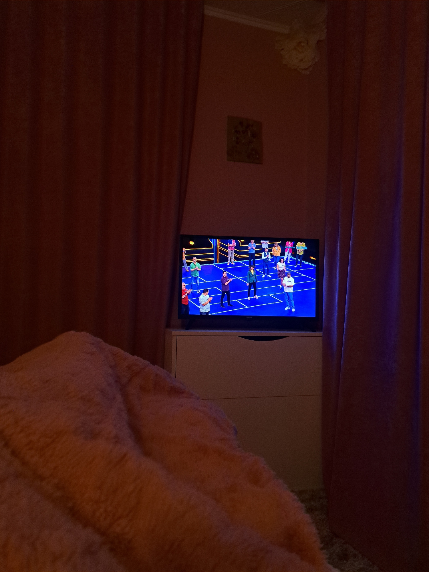 A television screen is displaying a colorful game show scene with multiple contestants standing on a set with blue and yellow accents. The screen is positioned above a white console or cabinet. The fo…read more