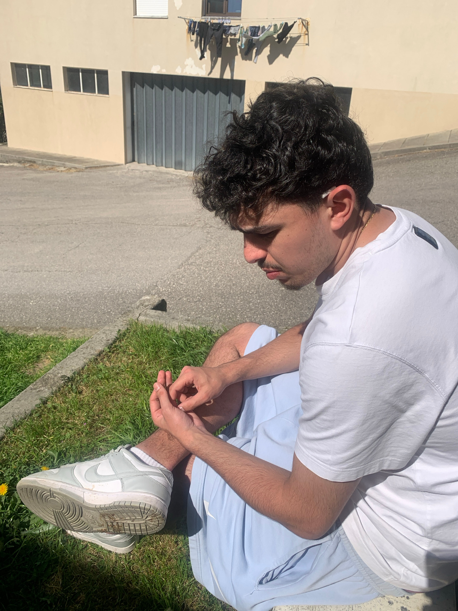 A young man with dark, curly hair is kneeling on a patch of green grass beside a paved area, likely a sidewalk or road in Vila Real, Portugal. He is wearing a white t-shirt and light blue shorts. He i…read more
