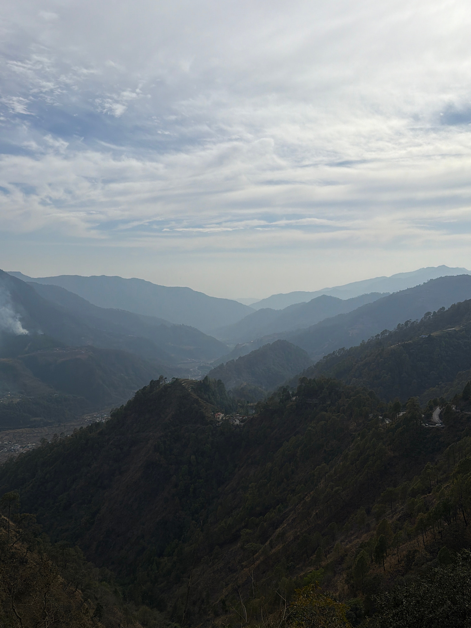 The image captures a mountainous landscape in Bhimphedi, Nepal. The sky, filled with wispy clouds, occupies the left portion of the frame. To the right, a series of mountain ranges recede into the dis…read more