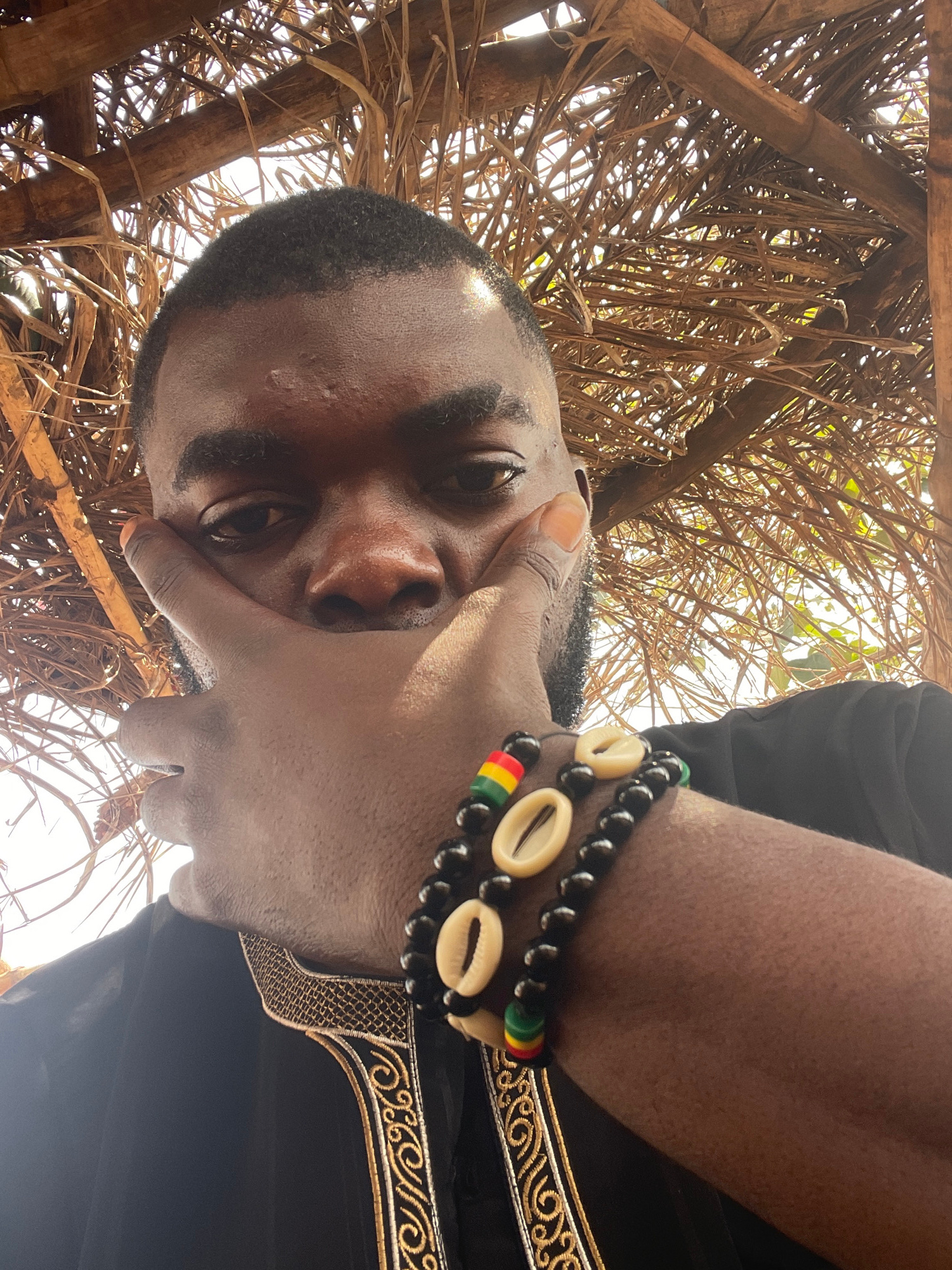 The media file presents a close-up portrait of a person with dark skin, oriented such that their head is on the right side of the frame, tilted. The camera appears to be positioned below the subject,…read more
