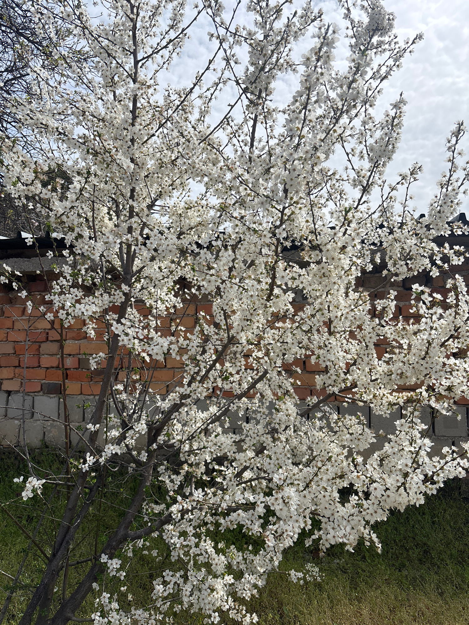 The image depicts a blossoming tree with white flowers against a backdrop of a brick wall and a sky with scattered clouds. Green grass is visible on the right side of the image. The tree is in full bl…read more