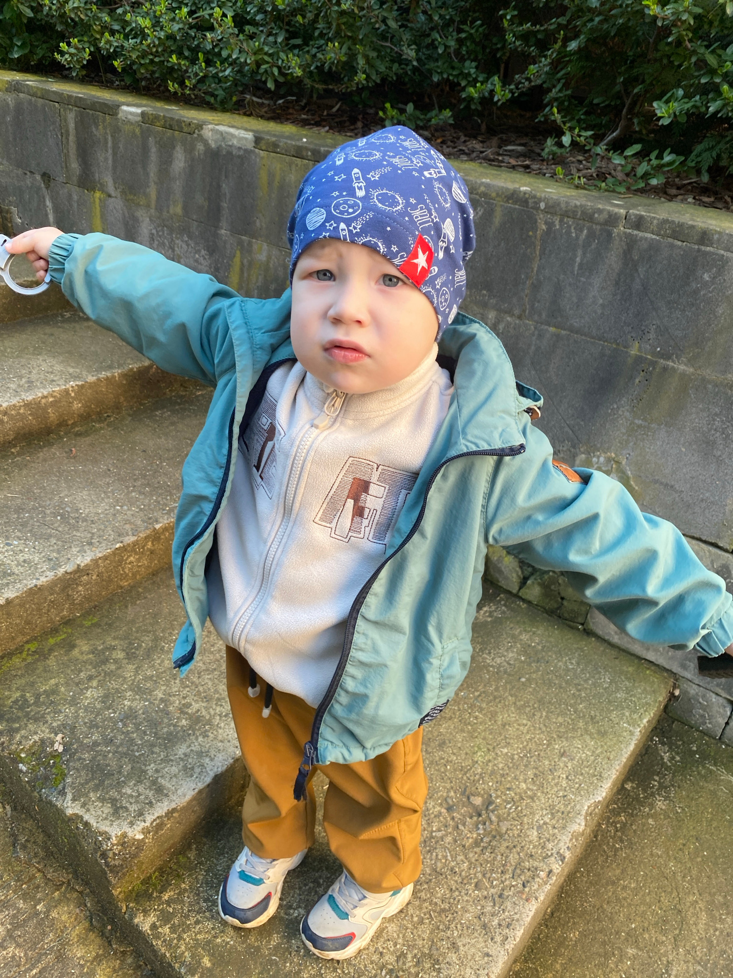A small child wearing a blue hat with space-themed designs, a light blue jacket, a white sweatshirt, and tan pants stands on a concrete staircase. The child also wears white sneakers with blue accents…read more