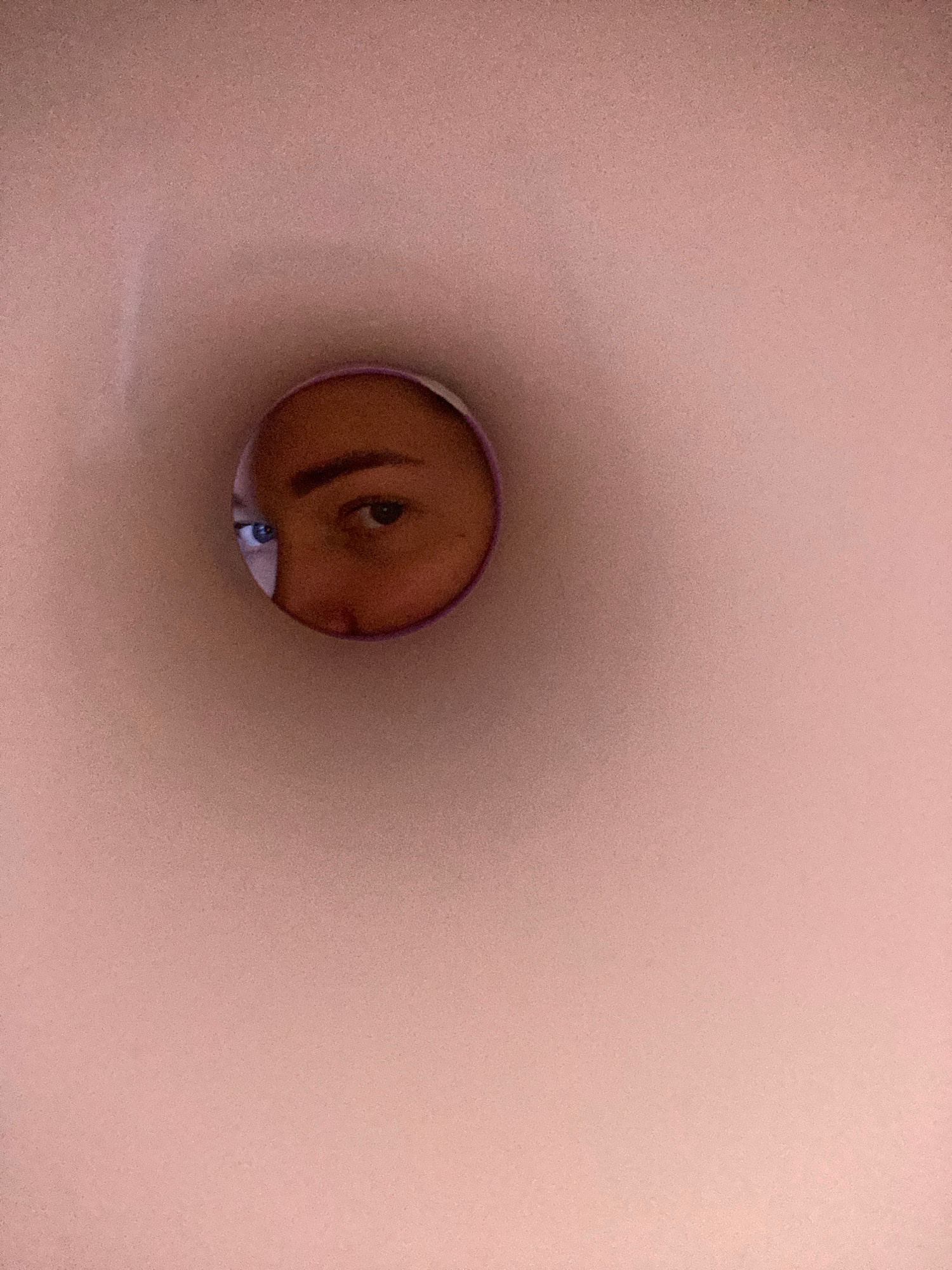 The image shows a partially obscured face of a doll within a circular frame. The doll has brown skin, one visible blue eye, and a brown eyebrow. The frame surrounding the face has a purple border. The…read more