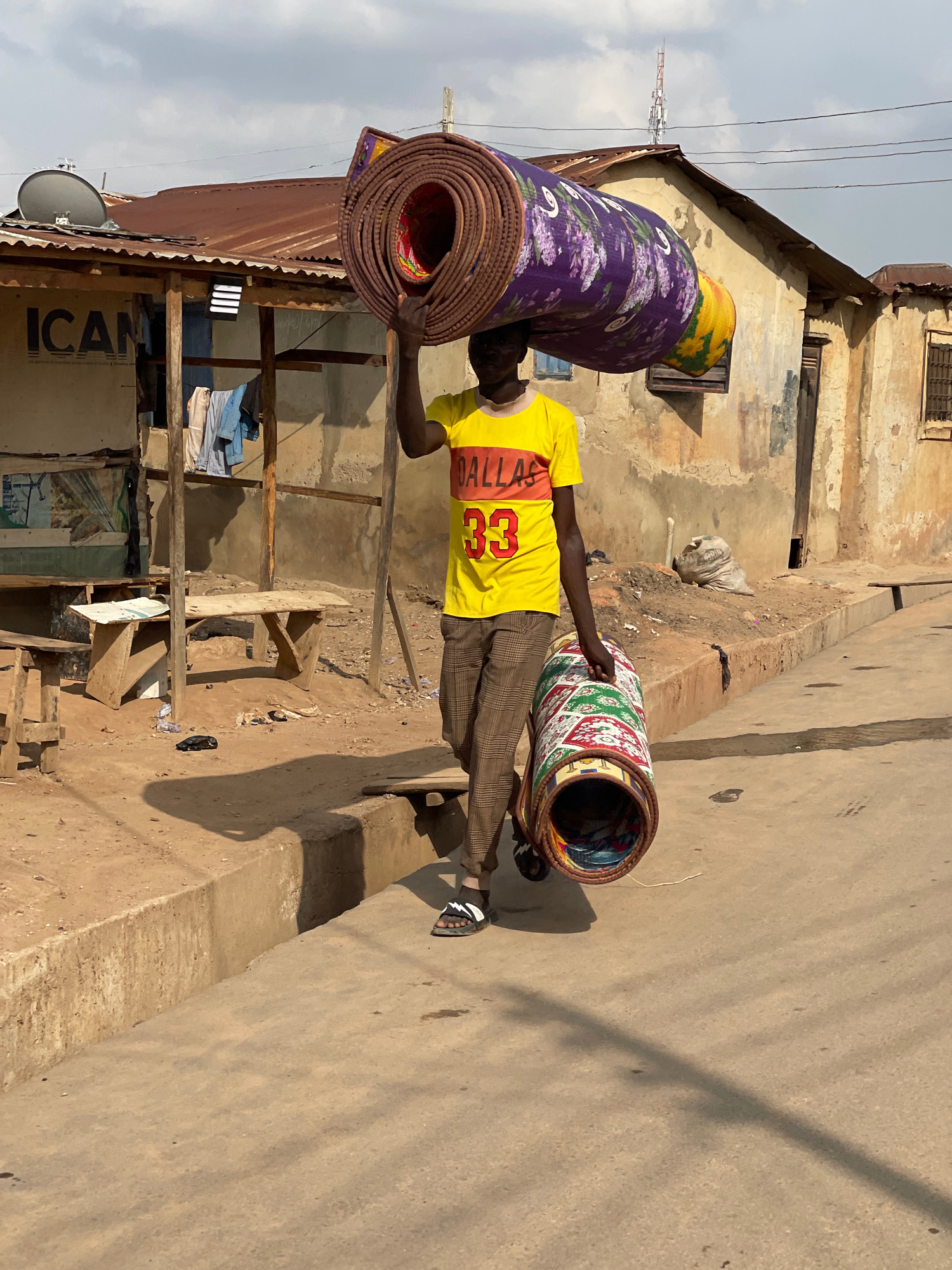 This image captures a bright street scene in Kuchingoro, Nigeria, likely during the morning or late afternoon, as indicated by the long shadows cast across the ground. The central figure is a man, dre…read more