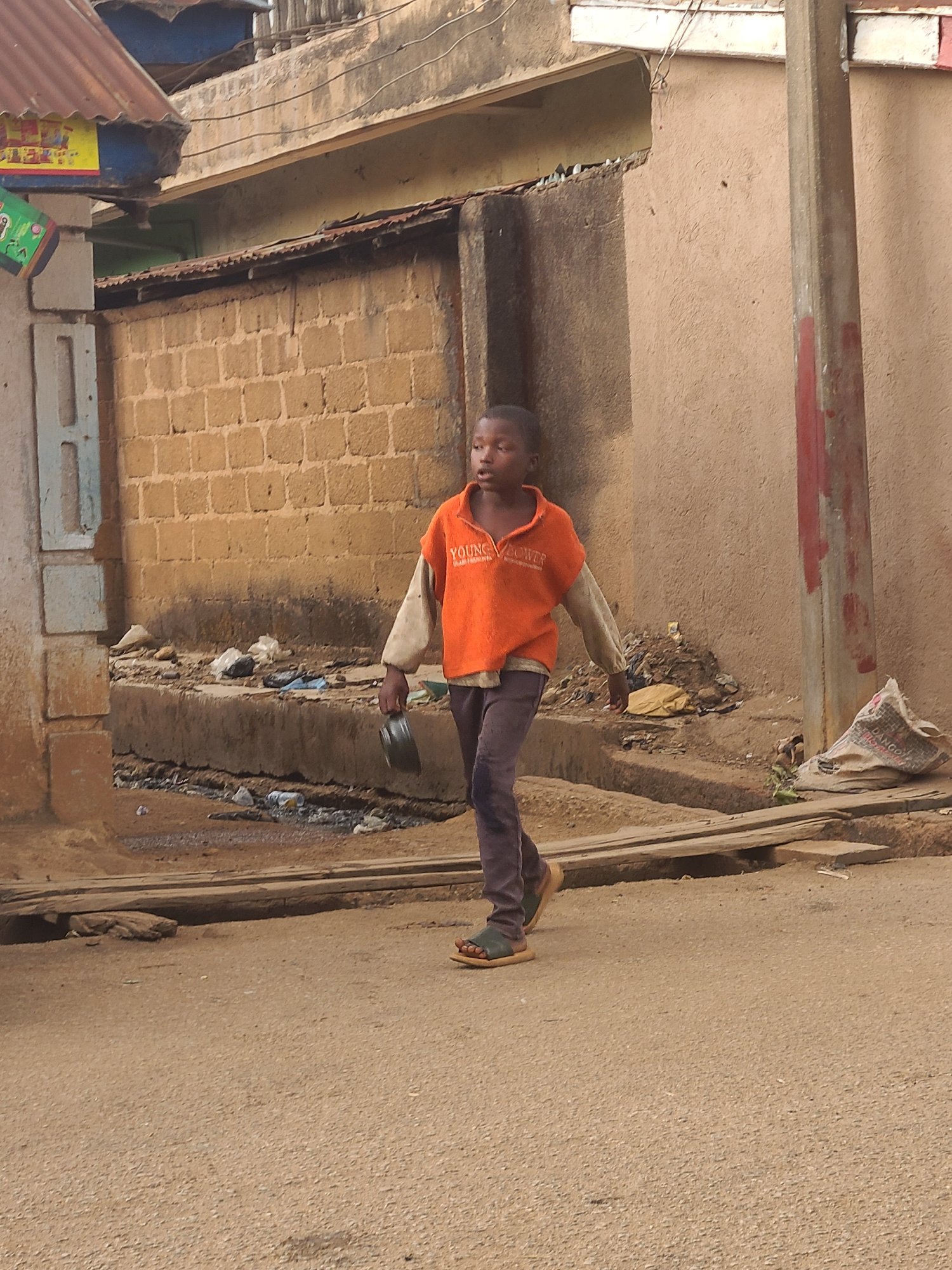A young boy stands on a street in Jos, Nigeria. He wears an orange shirt, dark pants, and sandals. He is holding a small, dark-colored bowl. To his left is a brick wall and a small structure. To his r…read more
