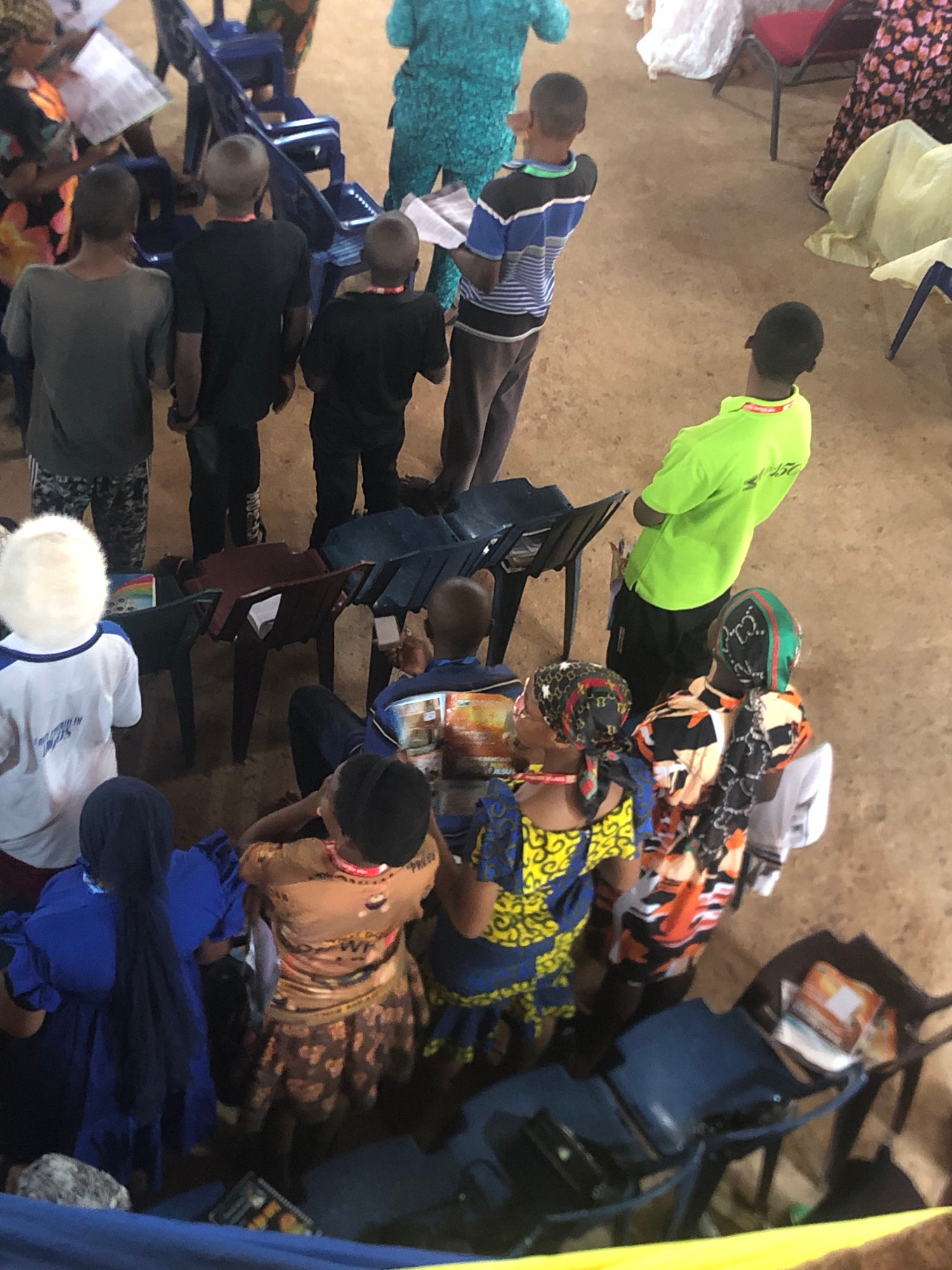 A high-angle shot shows a group of people seated in rows of chairs in what appears to be an indoor space. The setting is in Obosi, Nigeria. The people are likely attending an event or service, perhaps…read more