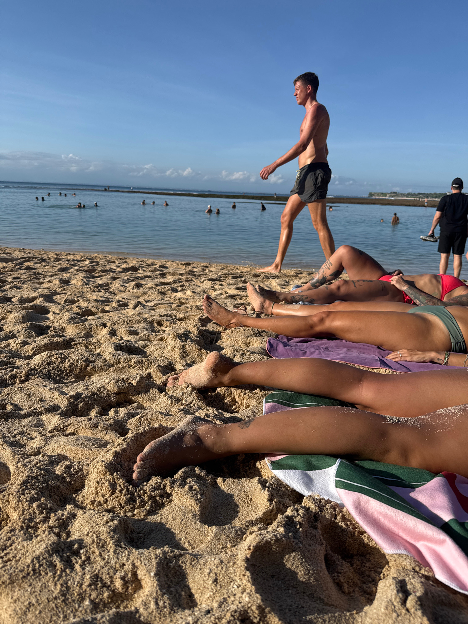 The image captures a beach scene in Kuta Selatan, Indonesia. A group of people are positioned near the shoreline. The foreground shows sandy terrain with the legs of several individuals; the legs areβ¦read more