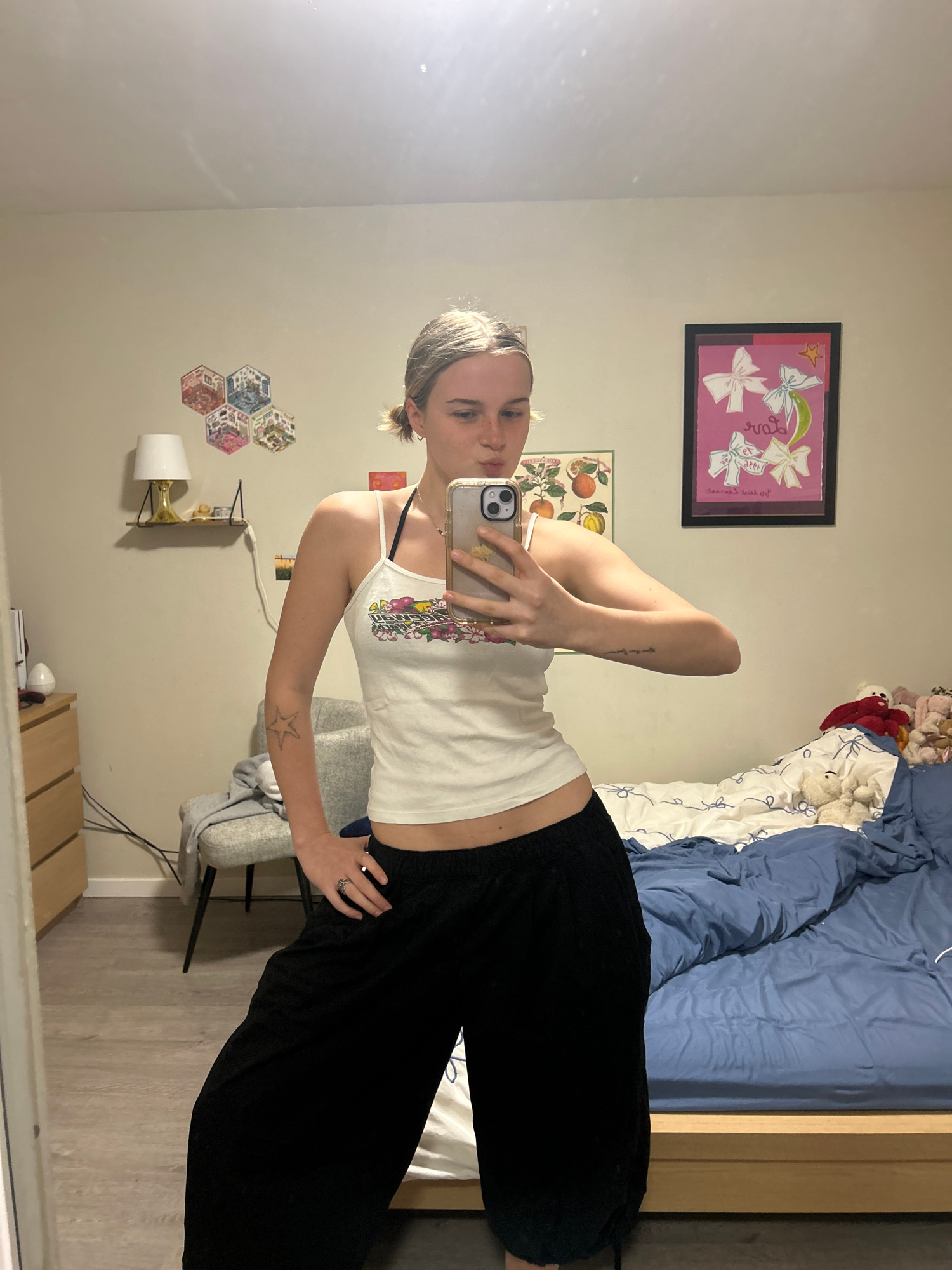 A young woman is taking a selfie in a mirror. She has blonde hair pulled back in a ponytail and is wearing a white tank top with black pants. Her right hand is on her hip and she is holding a phone in…read more