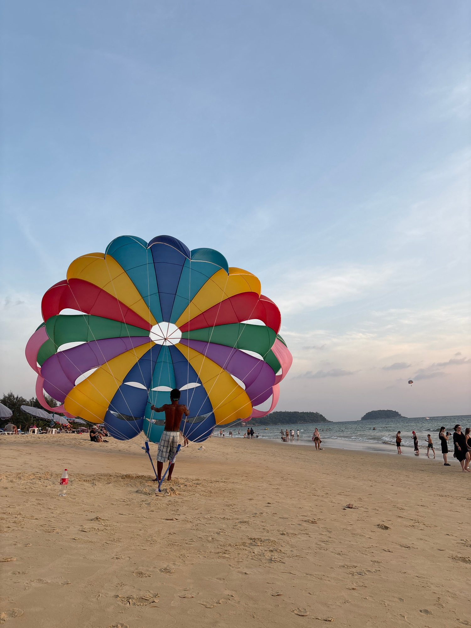 An eye-level, medium shot depicts a man standing on a sandy beach, holding ropes attached to a large, colorful parasail. The parasail is a mix of blue, yellow, red, green, and pink sections. The sky i…read more