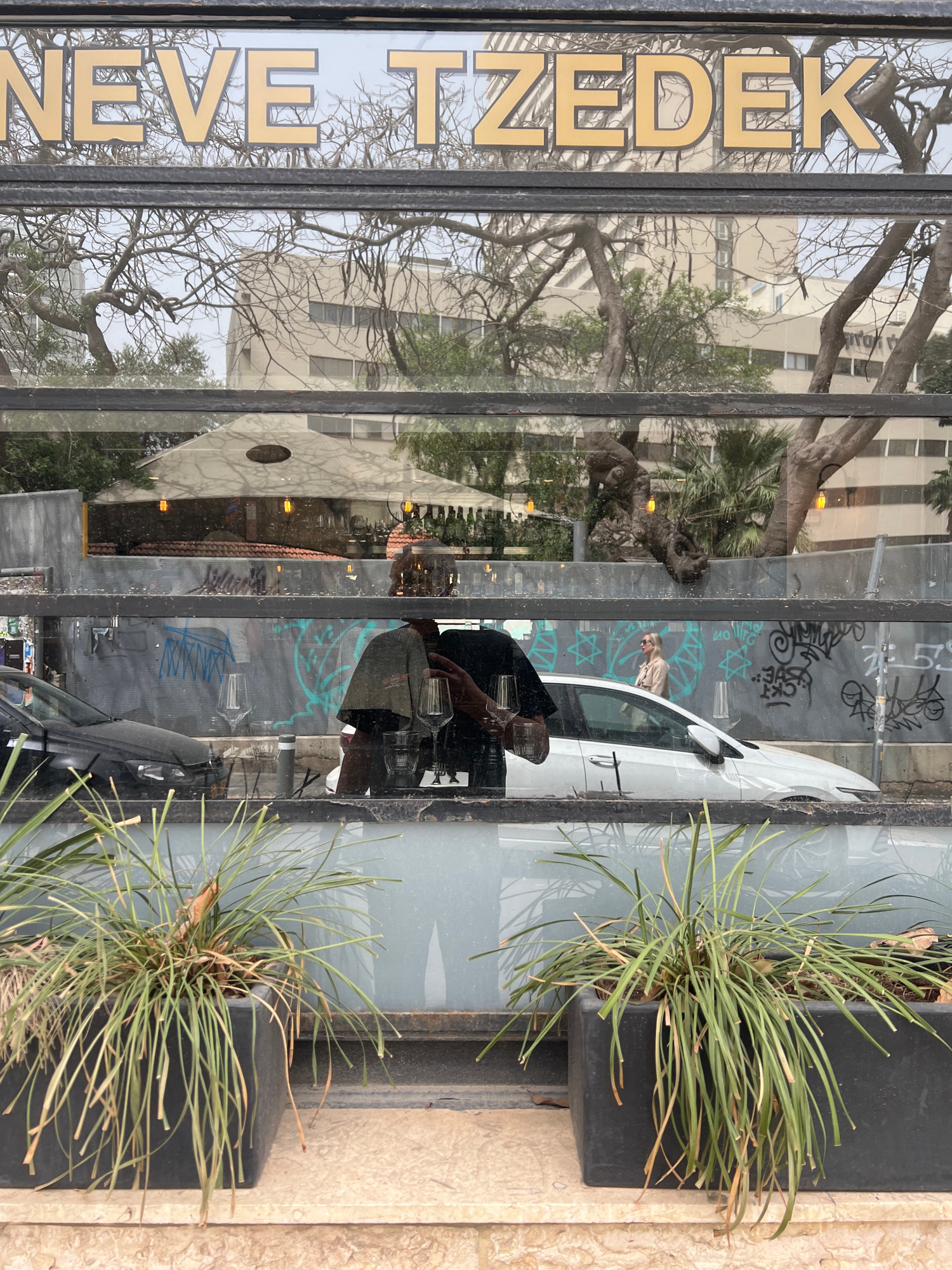 The image shows a street scene in Tel Aviv, Israel, viewed through a shop window. The storefront has the name "NEVE TZEDEK" vertically aligned on the left. The window reflects buildings and trees acro…read more