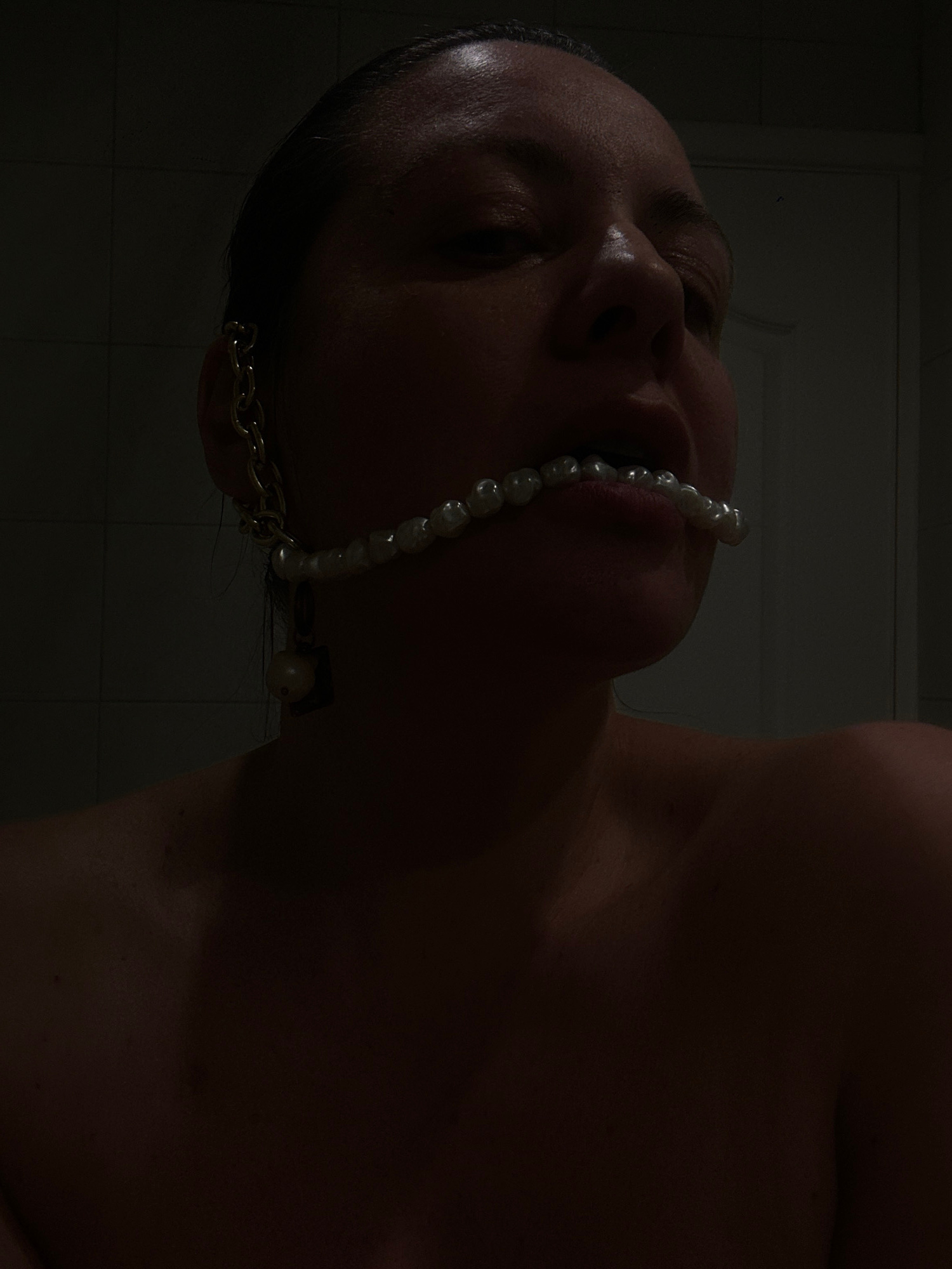 A close-up, low-angle photograph presents a person with their head tilted back, mouth slightly open, and a pearl necklace strung across their lips. The person appears to be partially nude, with visibl…read more