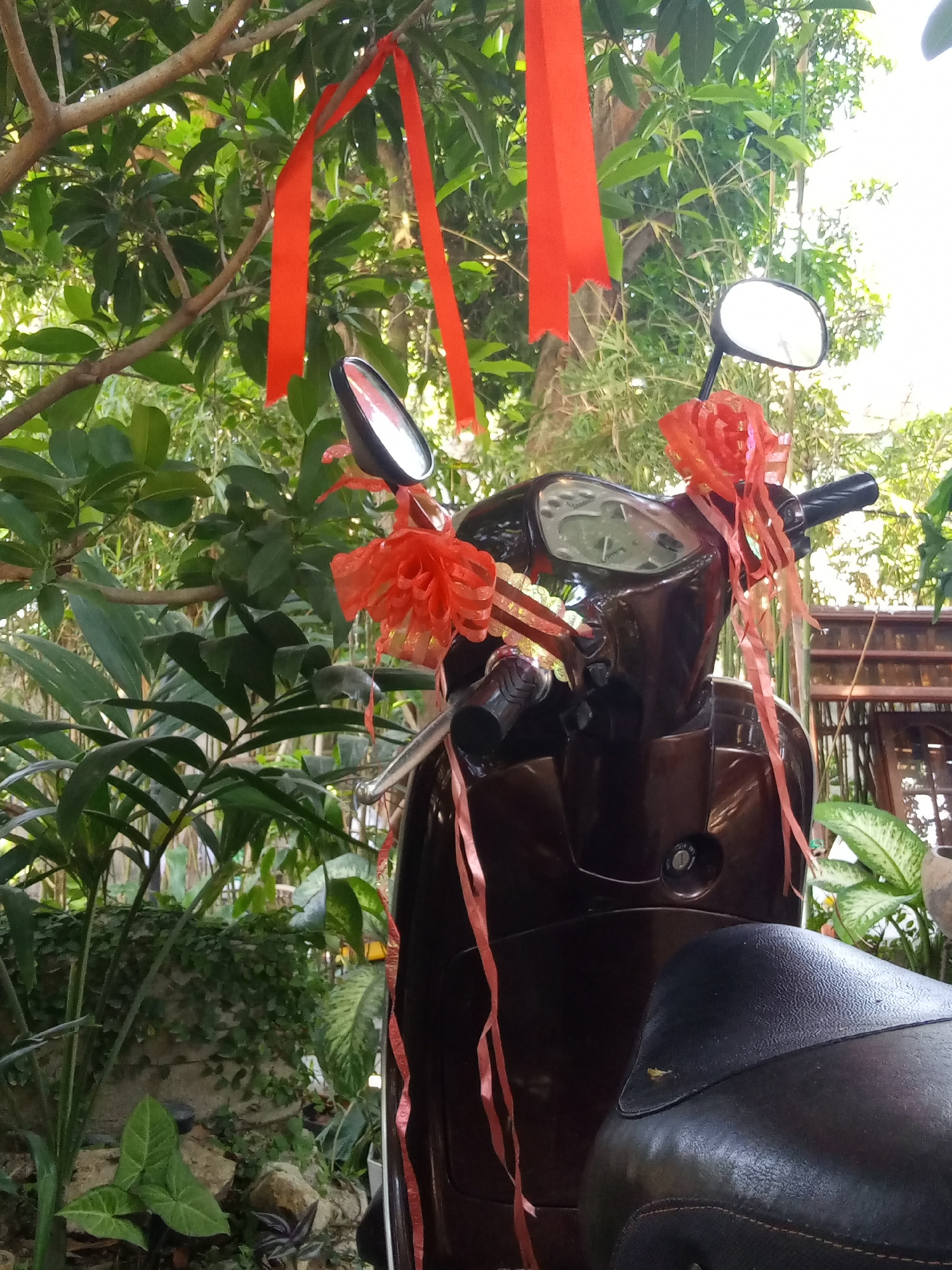 A brown scooter, decorated with red ribbons and bows, is parked outdoors amidst dense foliage, possibly within the Bac Natural Heritage Area Trang, Vietnam. Red ribbons are tied to a branch above the…read more