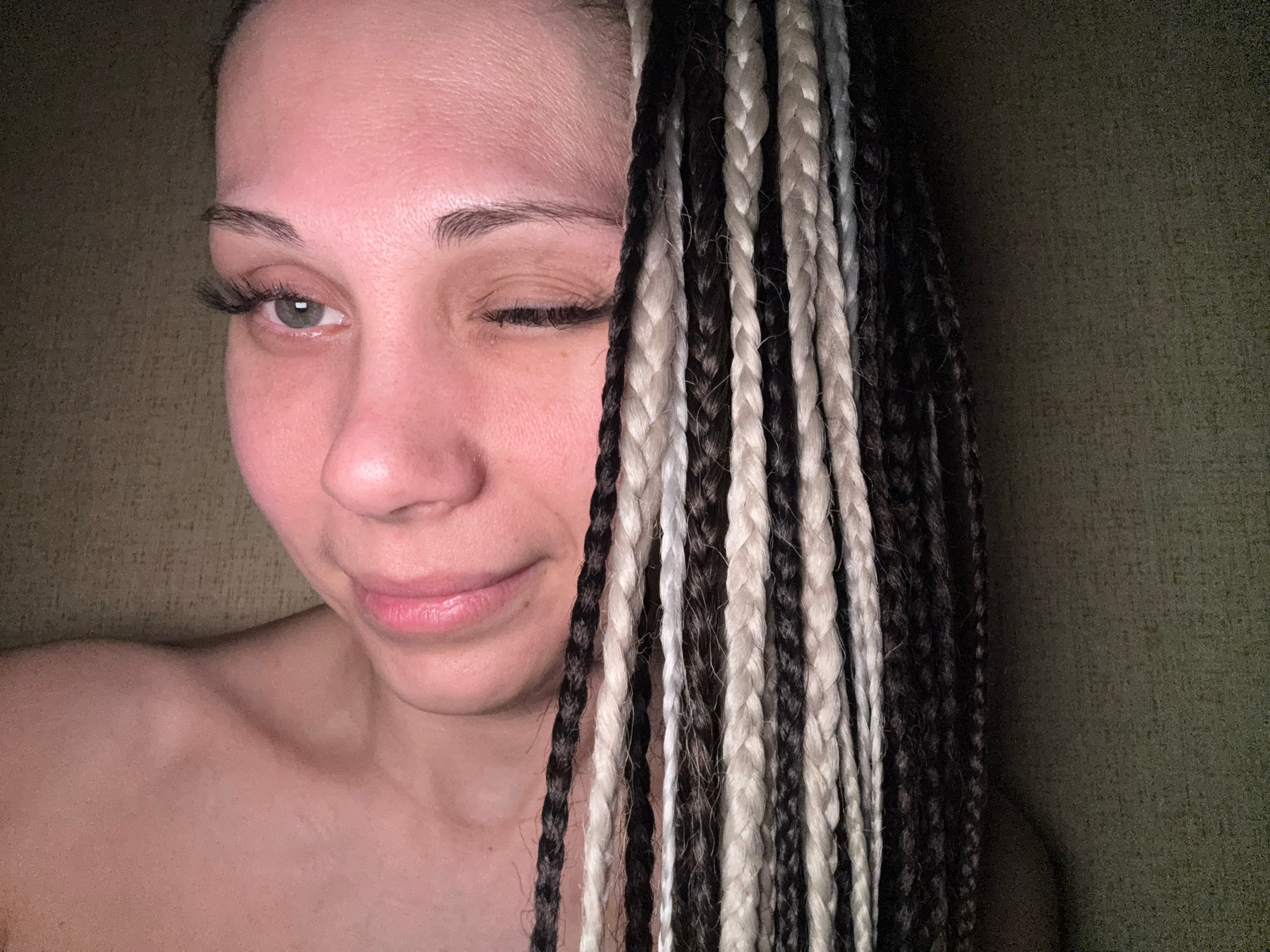 A fair-skinned person is lying on a green surface, possibly fabric. They are facing the camera with their head tilted. The person's hair is styled in dark and light-colored braids that partially coverβ¦read more
