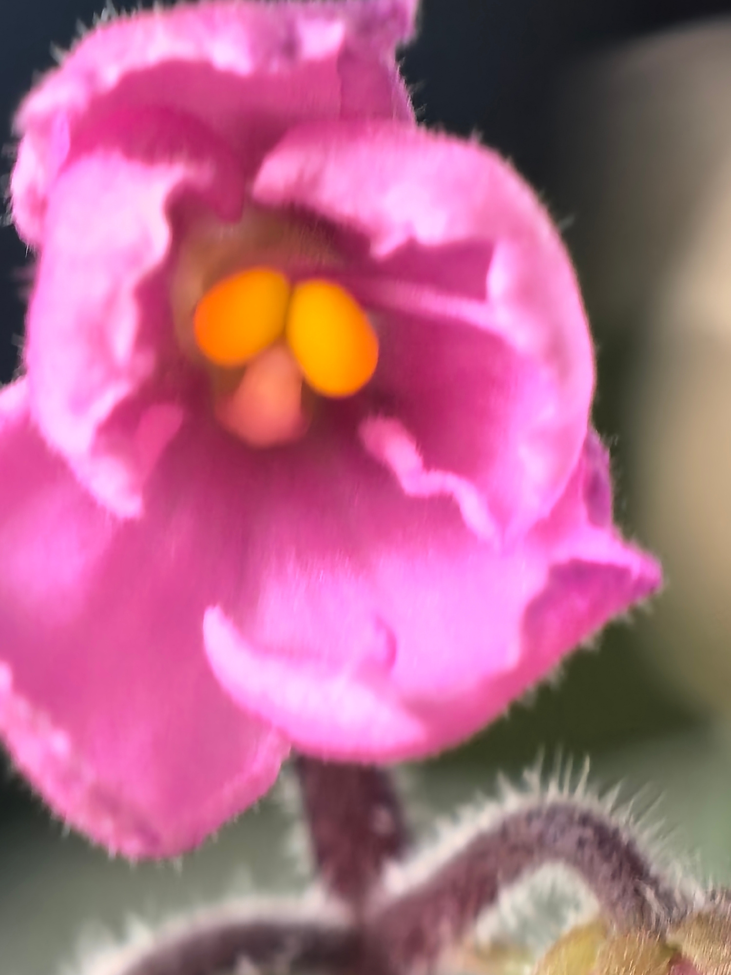A close-up photograph depicts a pink African violet flower. The flower features yellow stamen visible inside its pink petals. The stem is hairy. The background is blurred. The location is unknown.