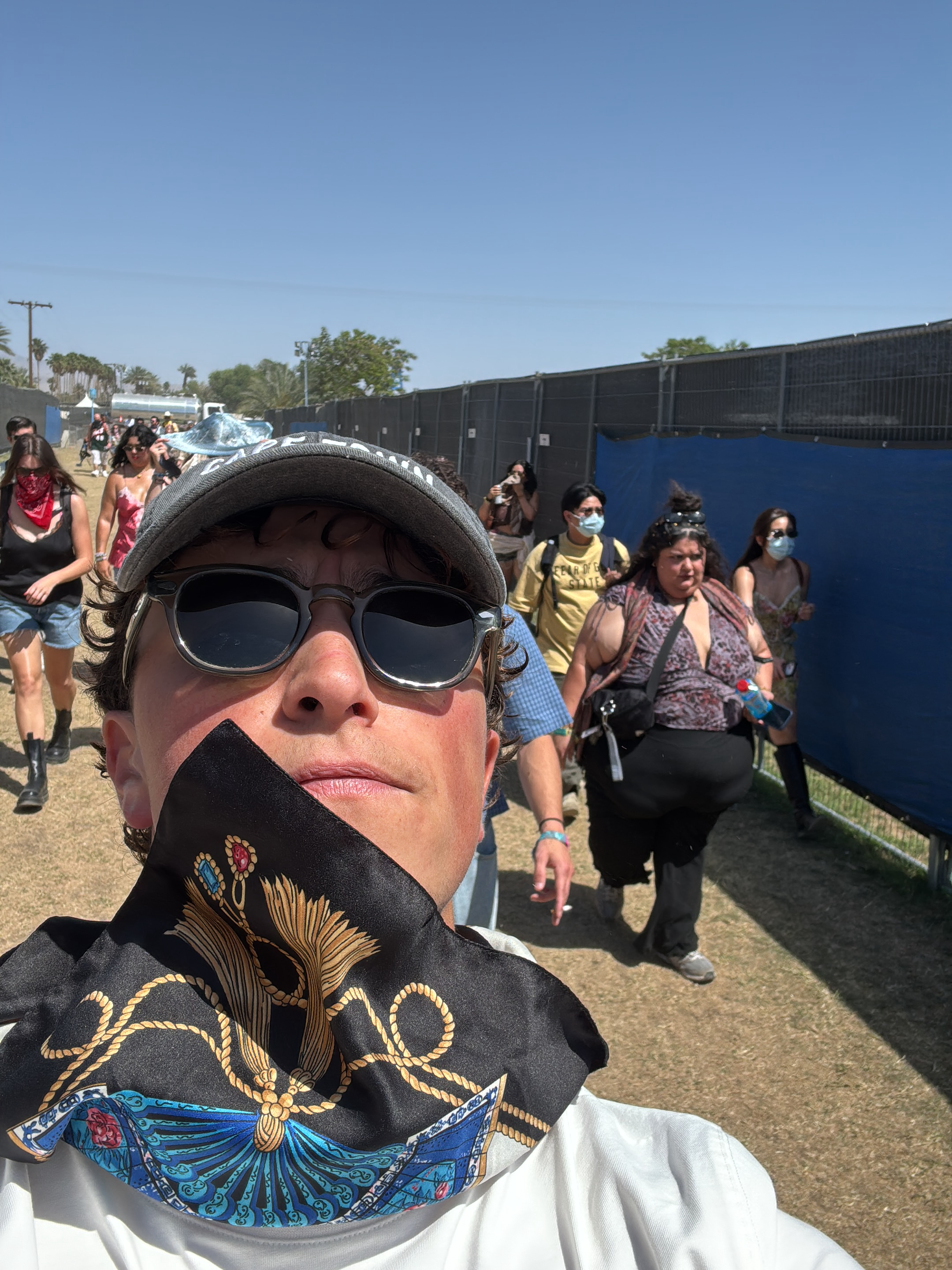 The image, taken in Indio, United States, captures a sunny outdoor scene with a crowd of people. The foreground features a person wearing a baseball cap and sunglasses, with a patterned scarf covering…read more