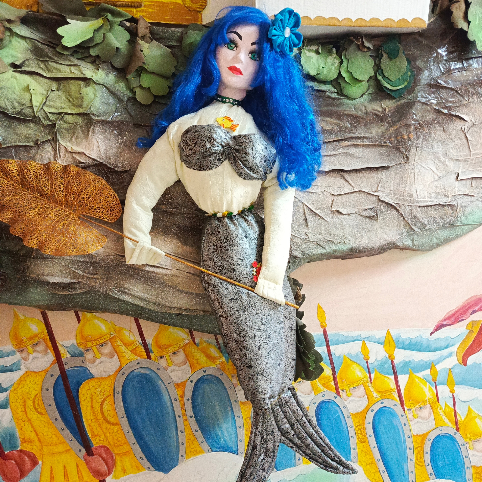 This is a photograph of an artistic display or diorama, likely indoors. The central figure is a handmade doll resembling a mermaid, with blue hair, a white blouse with a black patterned bodice, and aβ¦read more