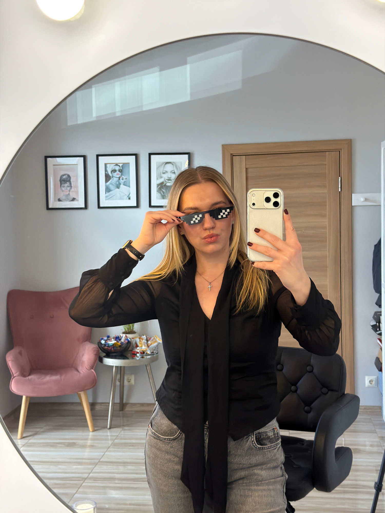 A woman is taking a selfie in a mirror. She is wearing black pixel sunglasses, a black top, and gray jeans. She has blond hair and is wearing a cross necklace. The location appears to be indoors, poss…read more