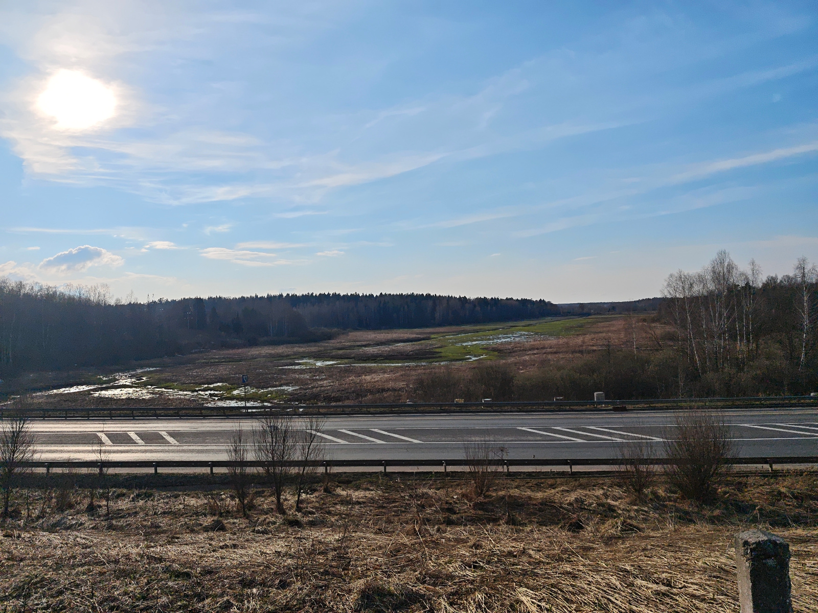 The image presents a landscape in Zhestylevo, Russia, featuring a road running across the midground of the frame. The road is multi-laned and divided by painted white lines. A metal guardrail runs alo…read more