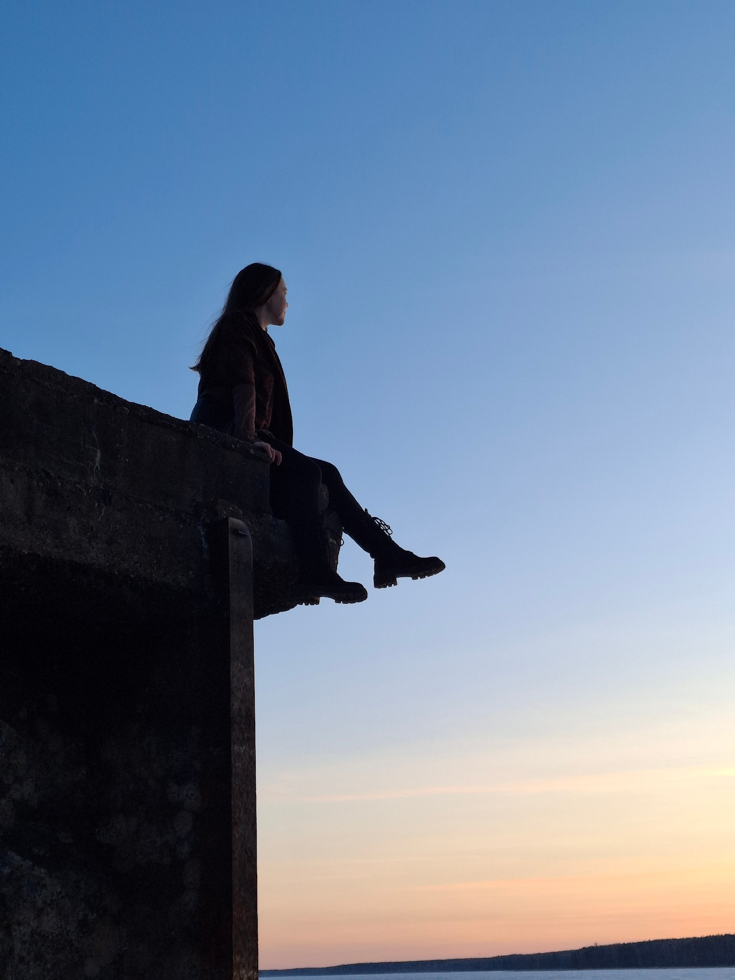 A person is silhouetted against a vast sky, seated on a dark, rough concrete or stone structure. The image, originally vertical, depicts the scene as if rotated 90 degrees clockwise. The figure, likel…read more