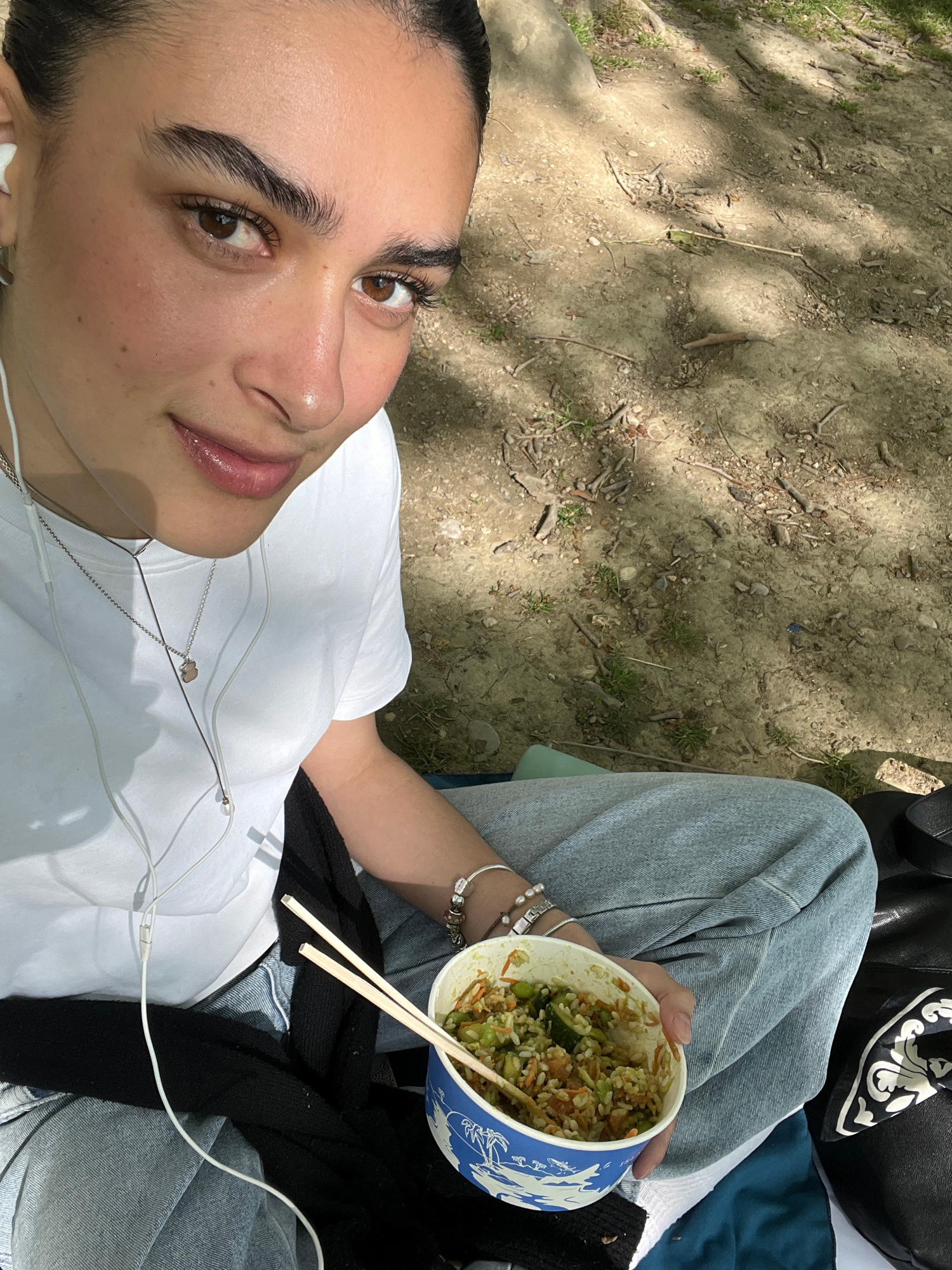 A young woman is captured in a high-angle shot, looking directly at the camera while sitting outdoors on the ground, likely in a park in Lyon, France. She has fair skin, dark hair, and brown eyes, wit…read more