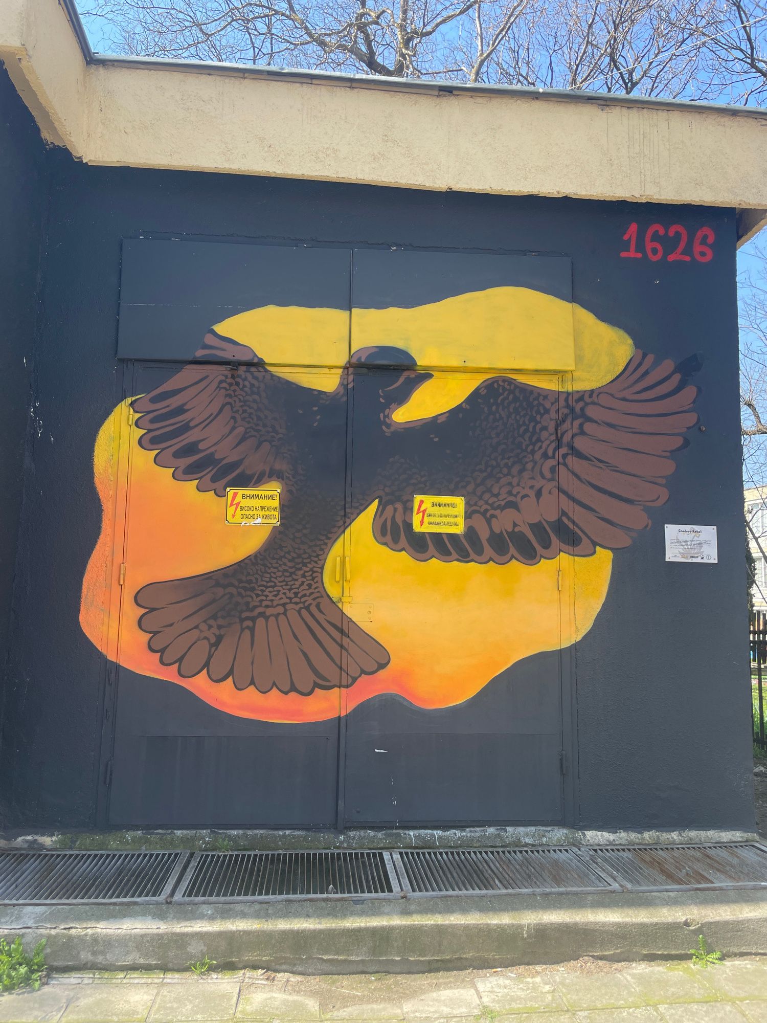 Here's a detailed description of the image: **Subject:** A mural painted on what appears to be an electrical or utility box. The mural depicts a bird, possibly an eagle or hawk, with outstretched wings silhouetted against a vibrant yellow and orange sun-like shape. **Location:** Based on the presence of Cyrillic script, the location is likely in Bulgaria. The mural also contains the text “Gradoobitatell” which indicates it could be near the city of Varna. **Details:** * **Mural:** The bird is predominantly dark brown with detailed feather patterns. The background sun is painted in bright yellow transitioning to orange towards the edges. * **Utility Box:** The painting is applied to a metal utility box. Two yellow warning signs with black lettering and a lightning bolt symbol in Cyrillic are affixed to the front of the box. A white certificate-like document is on the upper right. * **Surroundings:** The box is adjacent to a light-colored stucco building. To the right of the box, there's a concrete structure, likely part of the building's foundation, with ventilation slots. * **Number:** The number "1626" is painted in red on the left side of the box. * **Environment:** The sky is visible in the upper-left corner, suggesting an outdoor setting. | Open Wire