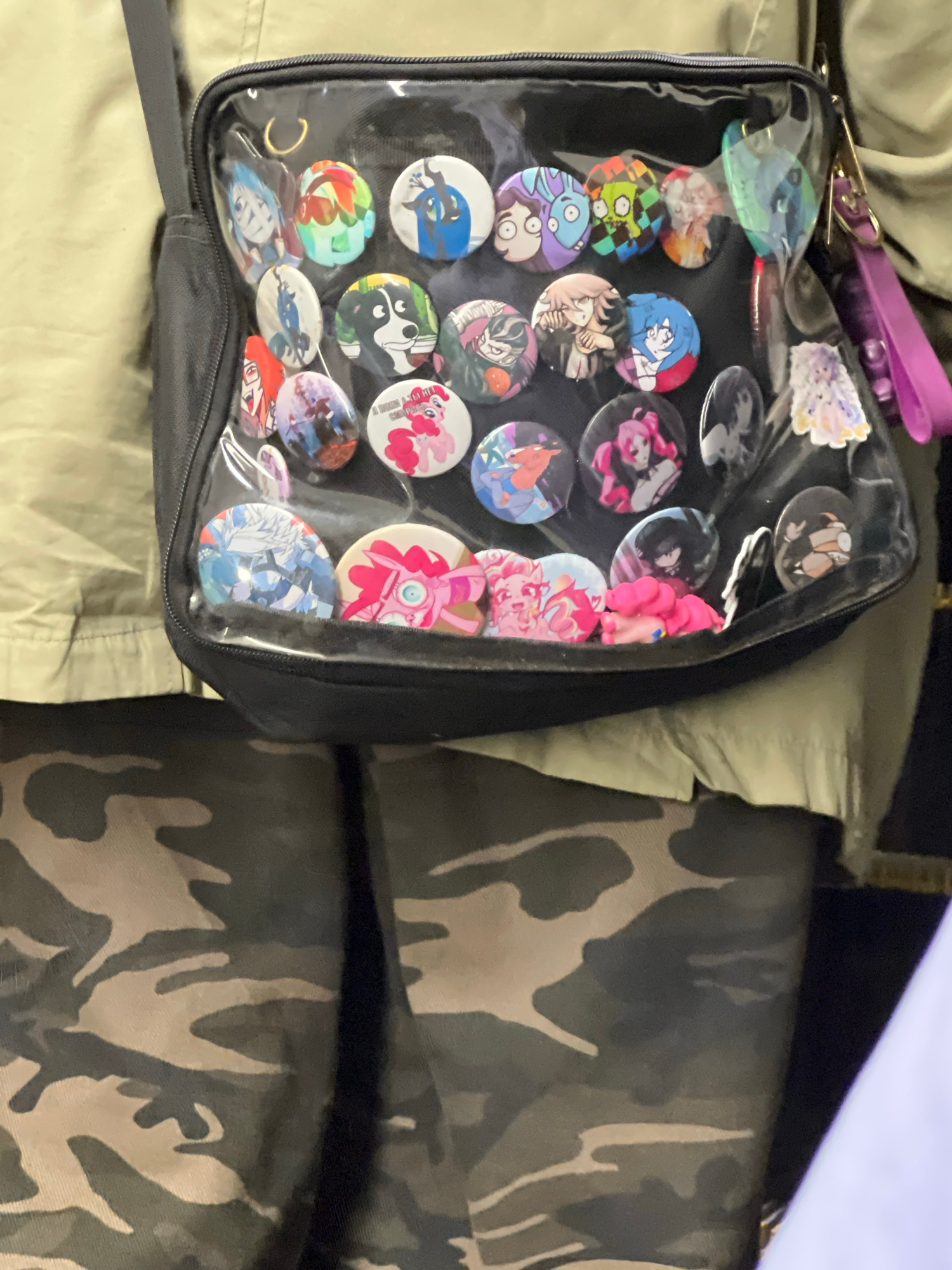 The image depicts a black bag filled with a collection of colorful buttons and a pink accessory. The bag is placed on top of khaki and camouflage patterned fabrics. The exact location in Shushary, Rusβ¦read more