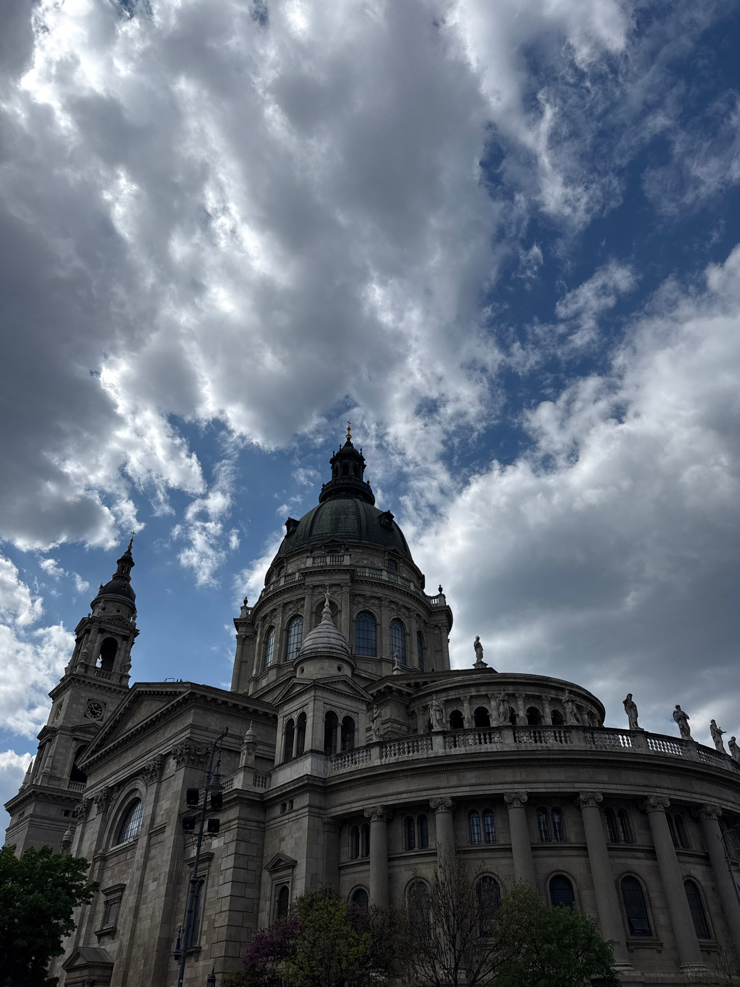 An upward-angled photograph of St. Stephen's Basilica in Budapest, Hungary, taken from a low perspective and rotated counter-clockwise. The grand stone cathedral dominates the right and bottom portion…read more