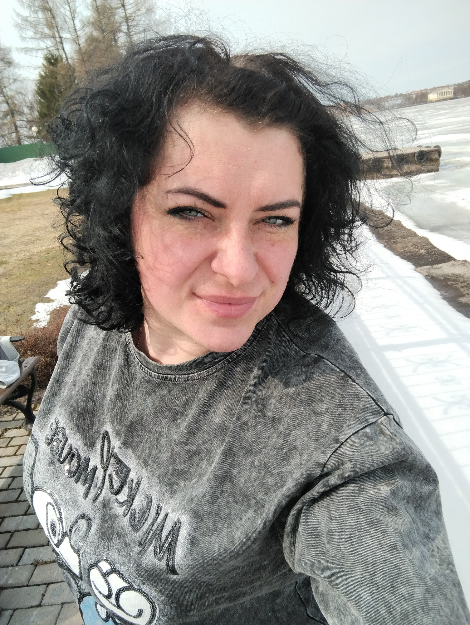 A woman with dark, curly hair is taking a selfie outdoors. She is wearing a grey sweatshirt with the words "Mickey Mouse" written on it, adorned with sequins. Her expression is a slight smile, and her…read more
