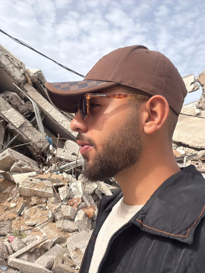 A male individual, seen in right profile, is positioned in the foreground against a backdrop of extensive structural damage in the city of Gaza, Palestinian Territory. He wears a brown baseball cap wi…read more