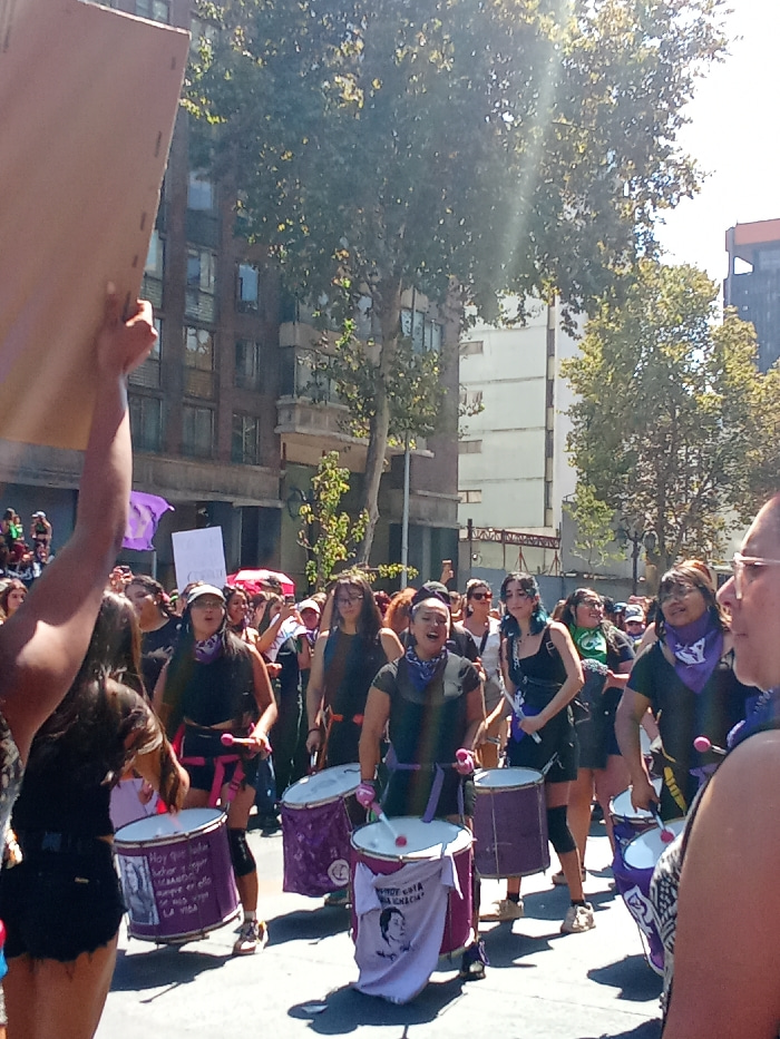 The image captures a daytime scene of a march in an urban street in Santiago, Chile. In the foreground and midground, a line of approximately six women, predominantly young adults, are actively playin…read more