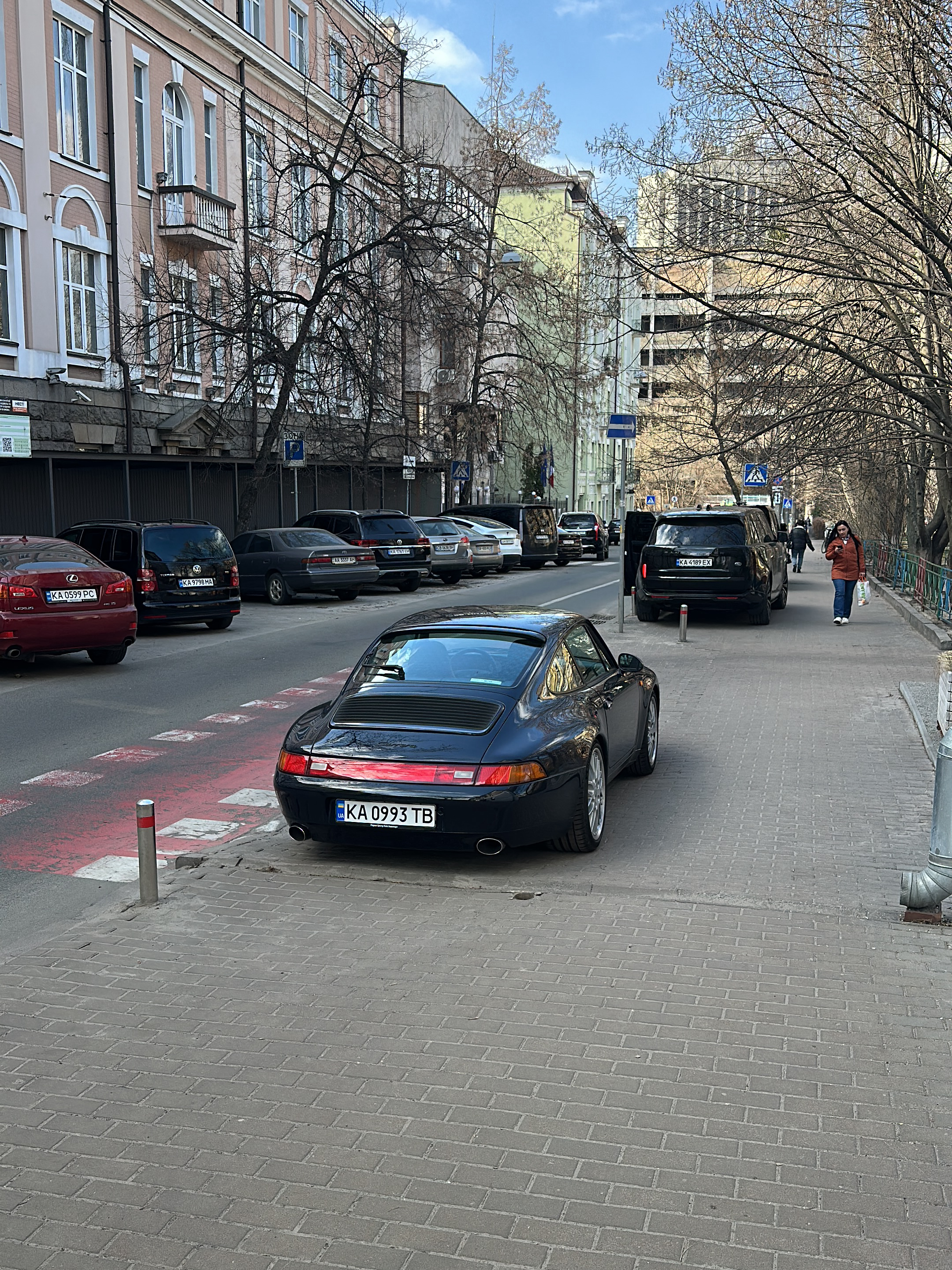 The image depicts an urban street scene in Kyiv, Ukraine, under a partly cloudy sky. The street runs diagonally from the lower-left to the upper-right of the frame. In the immediate foreground, a dar…read more