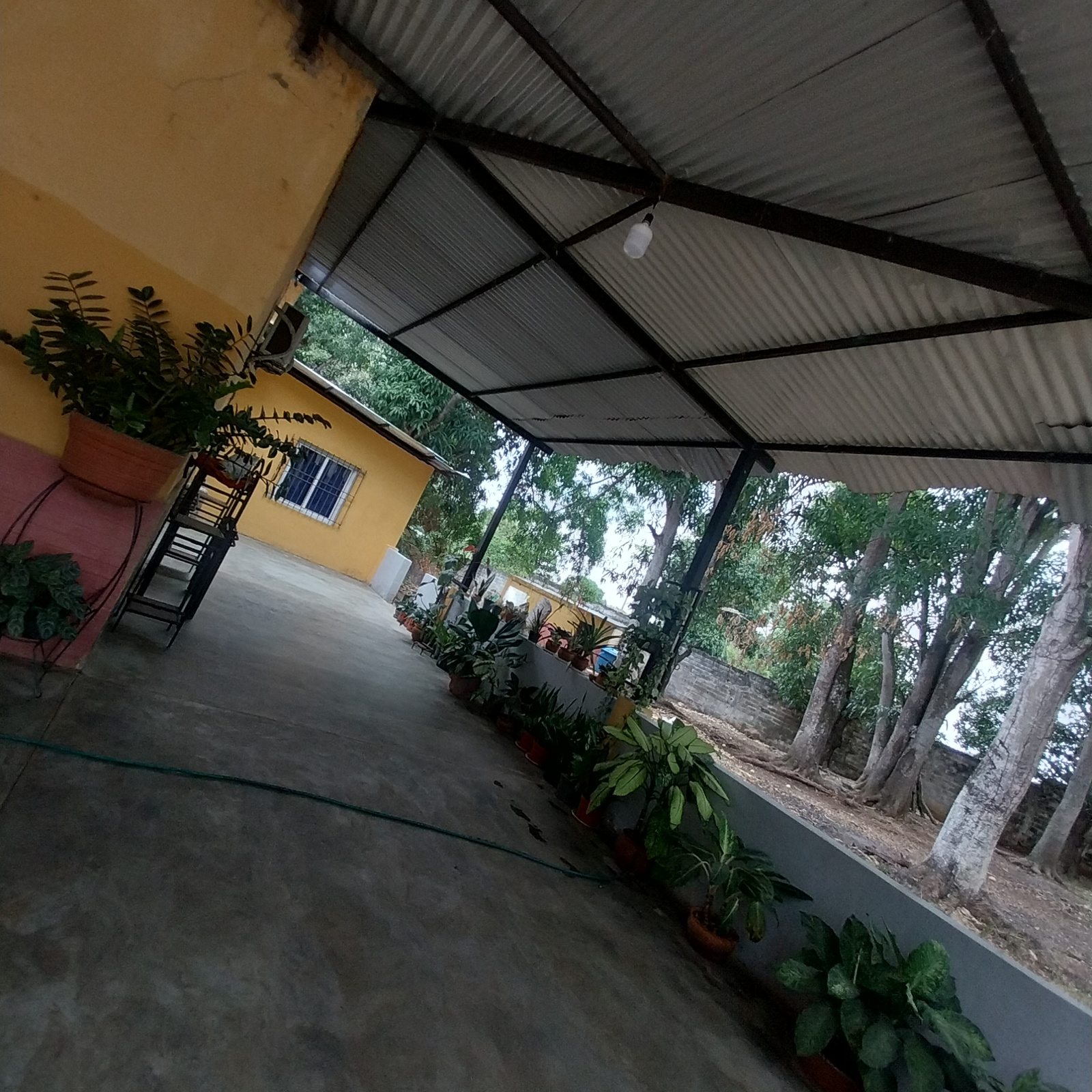 The scene depicts an outdoor space in Tinaquillo, Venezuela, partially covered by a corrugated metal roof supported by a dark metal frame. Under the roof, there is a light bulb hanging. The floor is c…read more