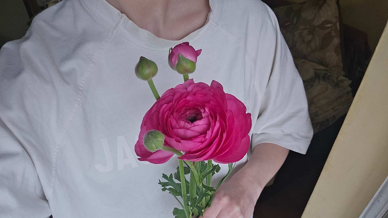 A person is holding a vibrant pink Ranunculus flower with several buds in front of a white t-shirt. The t-shirt appears to have lettering on it, though it is mostly obscured. The background includes a…read more