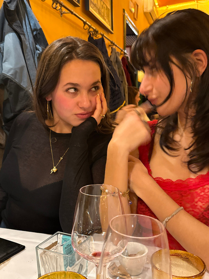 Two young women are at a table. One is wearing a black mesh top and gold jewelry, looking at the camera with a slight smile. The other is in a red lace top, with dark hair and bangs, leaning towards t…read more