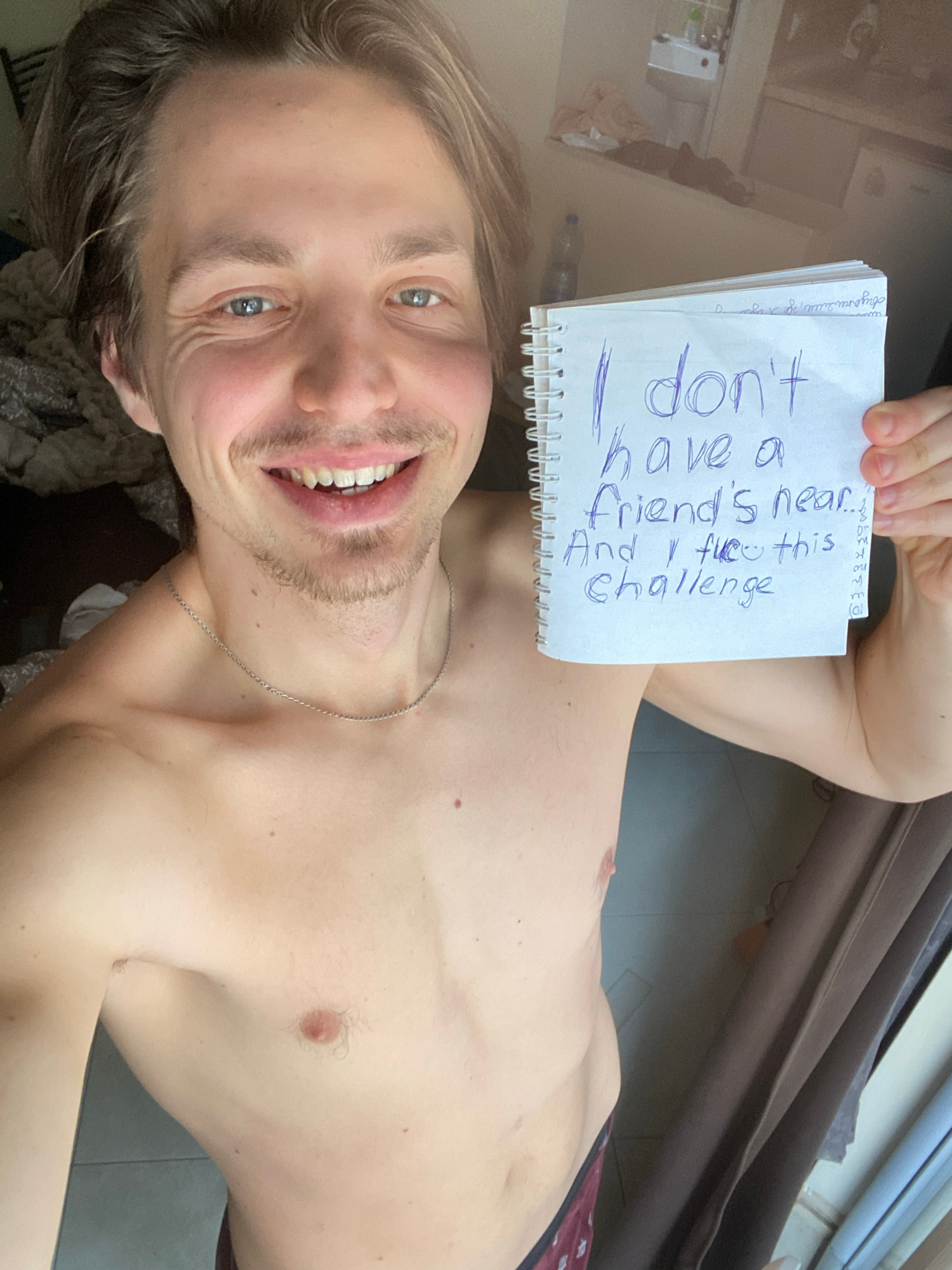 A selfie taken at an oblique angle shows a topless person holding a spiral-bound notebook. The handwritten text on the notebook reads "I don't have a friend's near.. And I like this challenge." The pe…read more