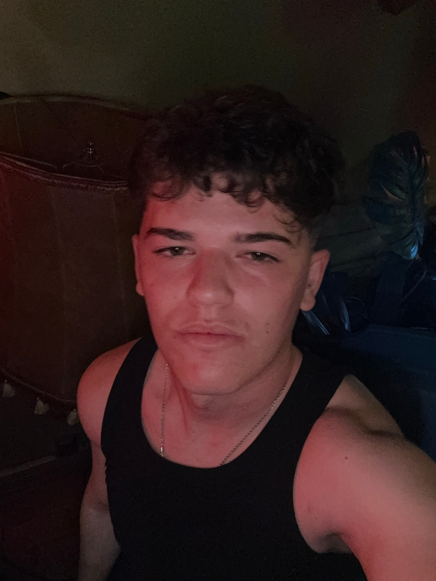 The image portrays a young man in a dimly lit indoor setting, captured in what appears to be a selfie or a close-up portrait. He is looking directly at the camera with a relaxed, slightly smirking exp…read more