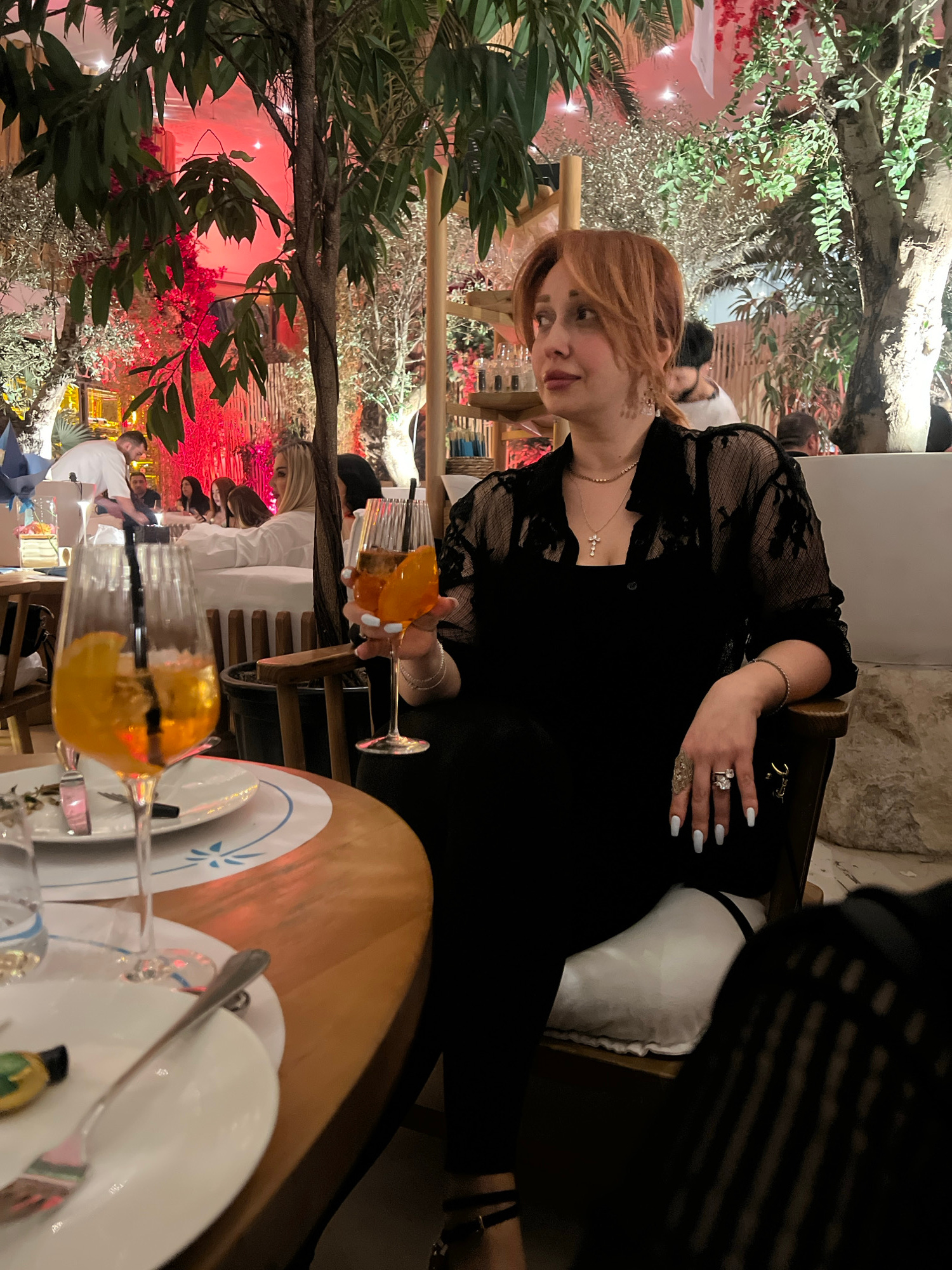 A woman with auburn hair sits at a restaurant table in Yerevan, Armenia. She is holding a cocktail glass with an orange beverage. Other patrons are visible in the background. The restaurant is decoratβ¦read more