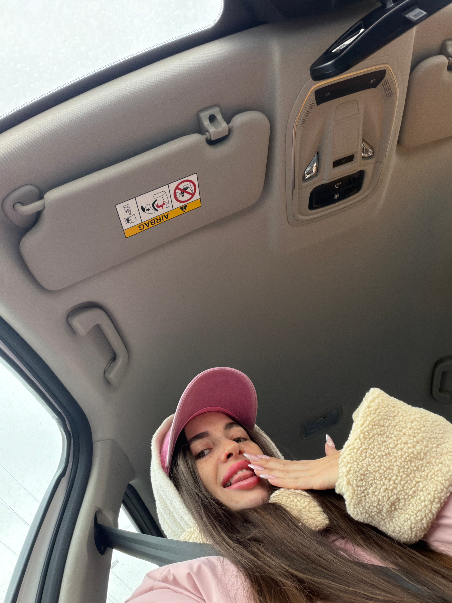 The image shows the interior of a car. The viewer is looking up from the passenger seat. The ceiling of the car is visible, with a sun visor and interior lights. A young woman wearing a pink hat and a…read more