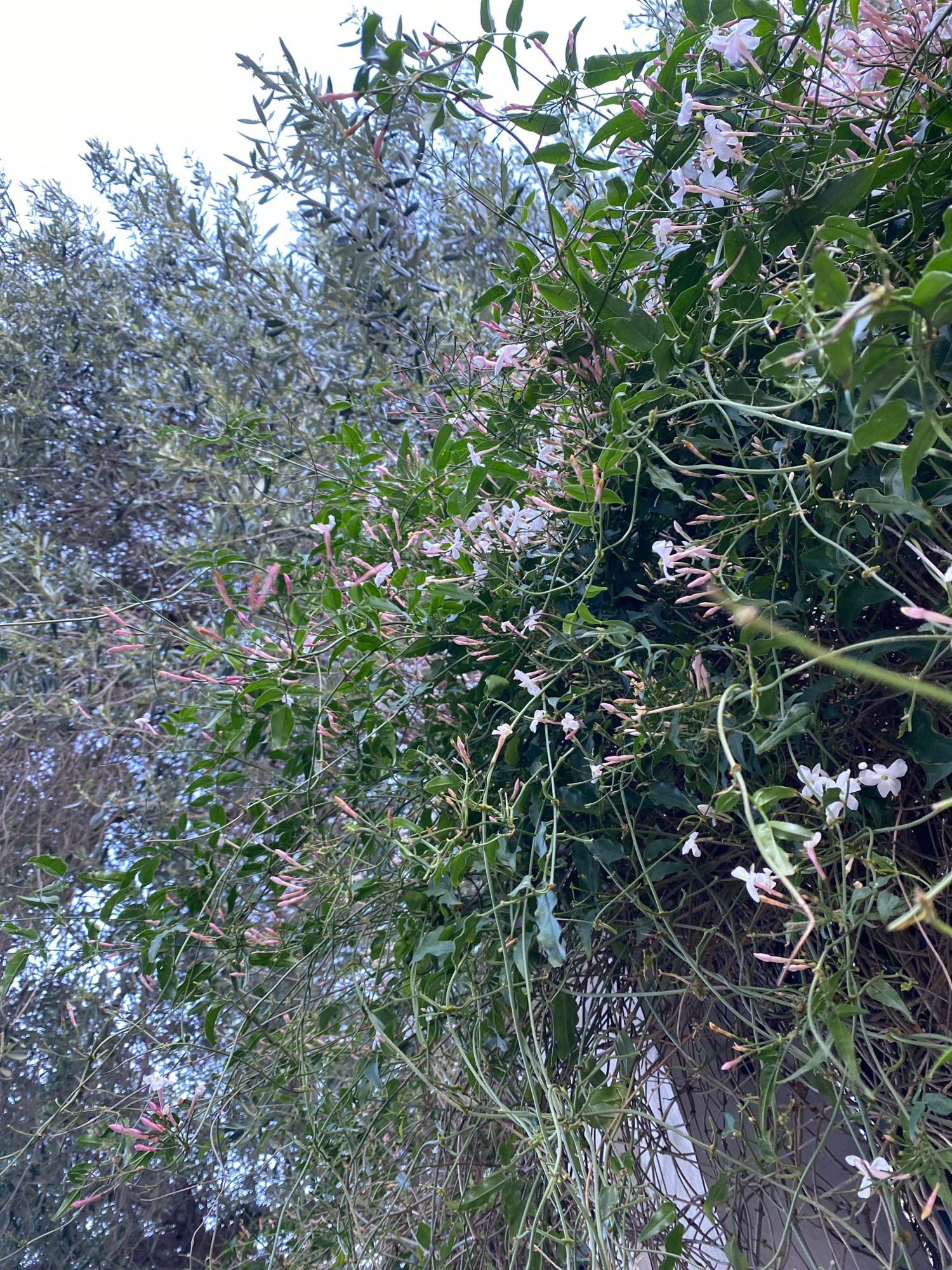 The image shows a view looking up at a flowering plant, likely a vine or climbing shrub. The plant features small, white flowers and green leaves. The background is blurred, showing other trees or fol…read more
