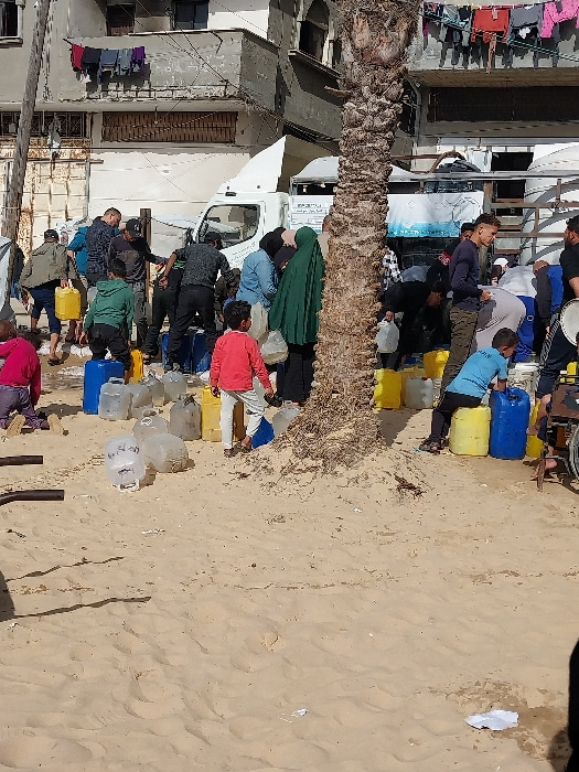 The image depicts an outdoor scene in Deir el-Balah, Palestinian Territory, characterized by a sandy ground cover and urban buildings in the background. A white delivery truck with a rear cargo enclosβ¦read more