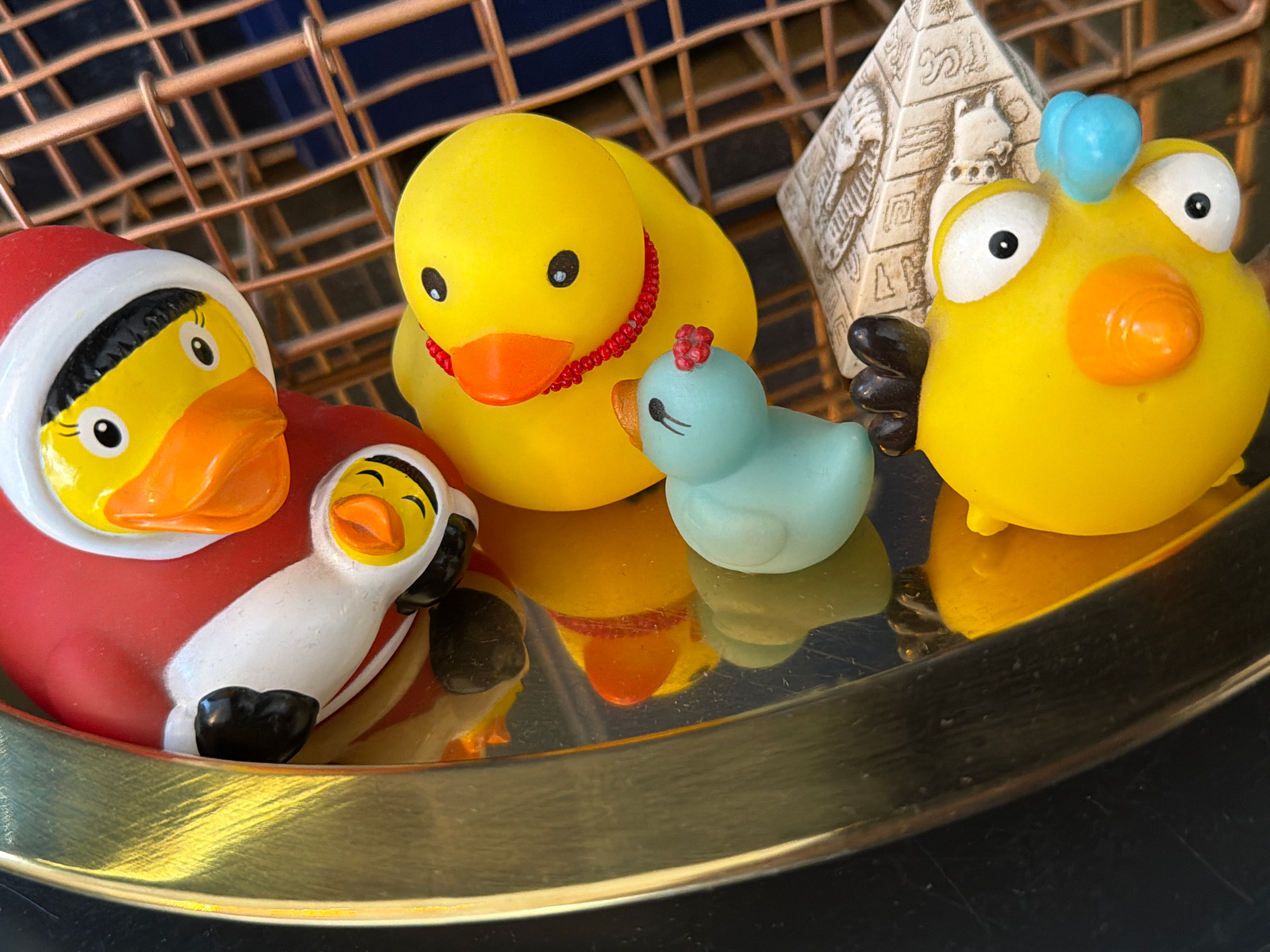 The image features a collection of rubber ducks and a small pyramid-shaped object arranged on a reflective gold-colored tray. The rubber ducks include a standard yellow duck, a blue duck with a red fl…read more