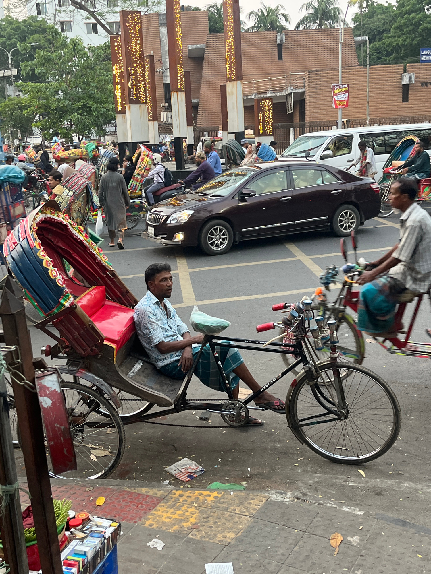 The image depicts a street scene in Dhaka, Bangladesh, featuring a parked dark brown car alongside a row of rickshaws and their drivers. One rickshaw driver is sitting in his vehicle. Another is opera…read more